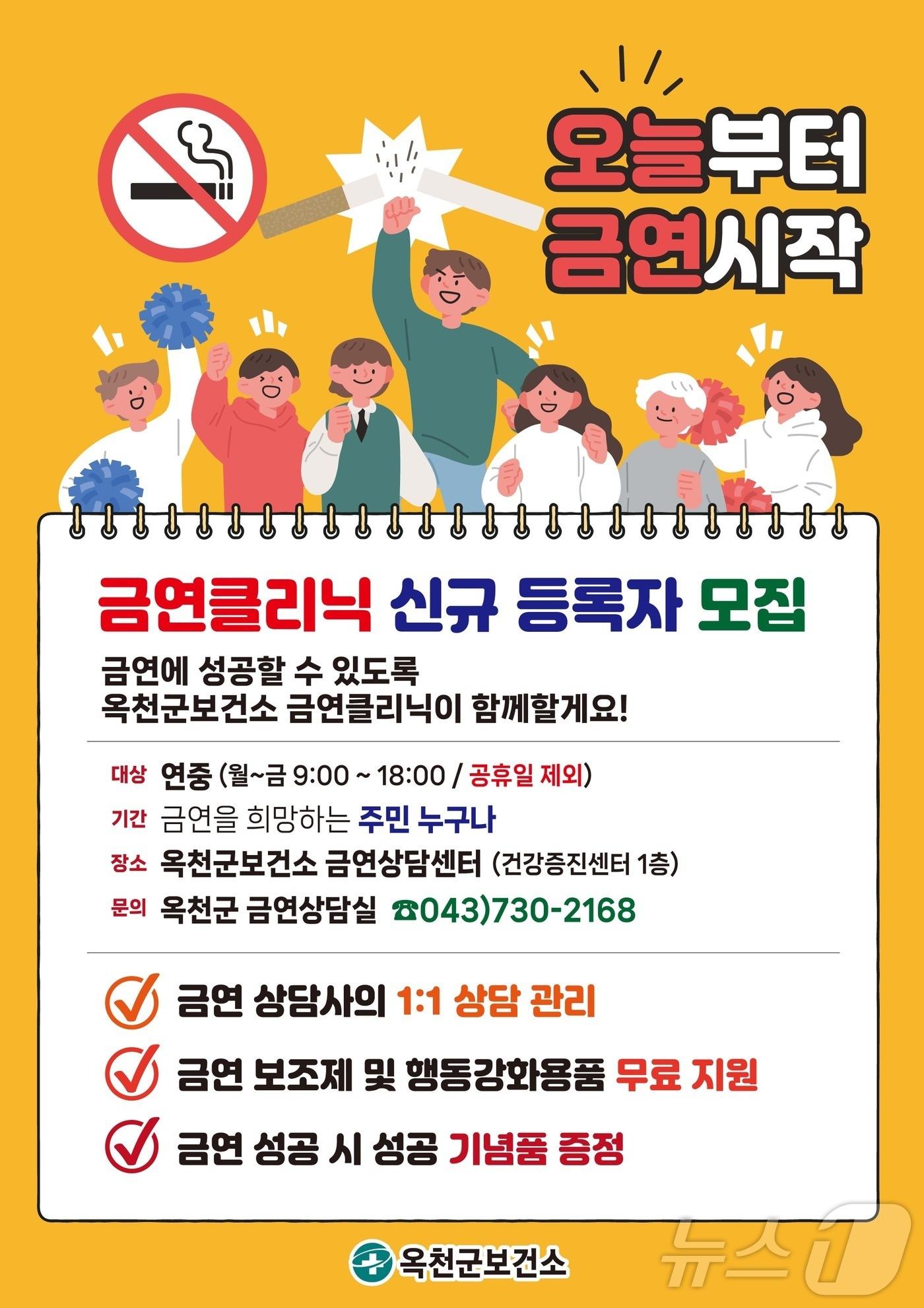 평일 오전 9시~오후 6시…전문가 상담 등 지원옥천군보건소 금연클리닉 운영 홍보물 (옥천군 제공) /뉴스1 관련 키워드옥천군금연클리닉장인수 기자 옥천군 '기본소득 15만원' 내년 3월에나 지급 가능할 듯보은·옥천서 동지 팥죽 나눔 이어져 '훈훈'관련 기사옥천군보건소 모바일 금연관리 참가자 선착순 모집옥천군보건소 '찾아가는 사업장 금연클리닉' 운영