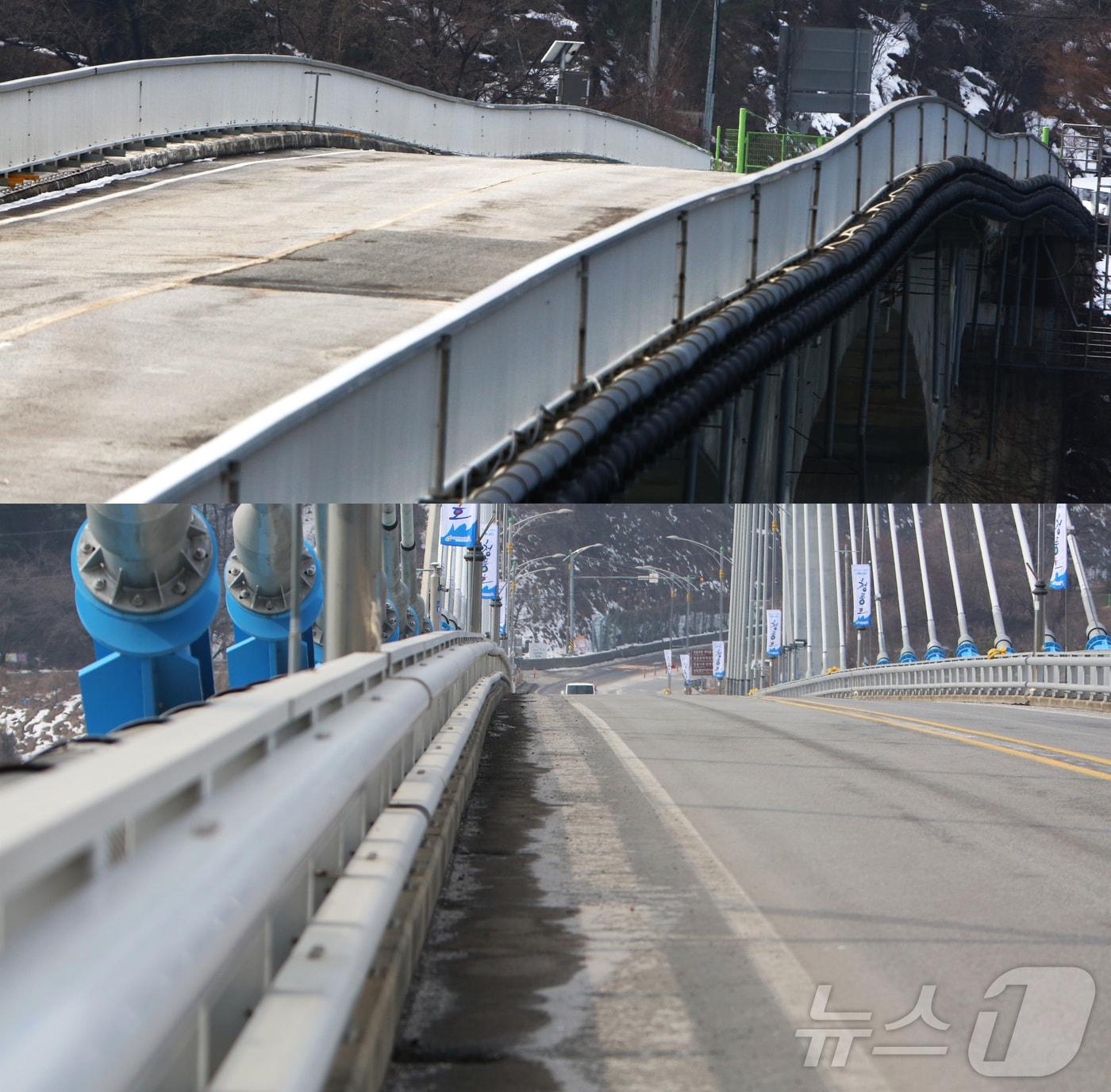 제천 옛 청풍대교 상판에 파도처럼 일렁이듯 위아래로 구부러진 뱀 모양의 '기이한 모습'(위)과 자연스럽게 곧게 뻗은 신 청풍대교(아래).(재판매 및 DB금지)/2025.2.17/뉴스1 ⓒ News1 손도언 기자