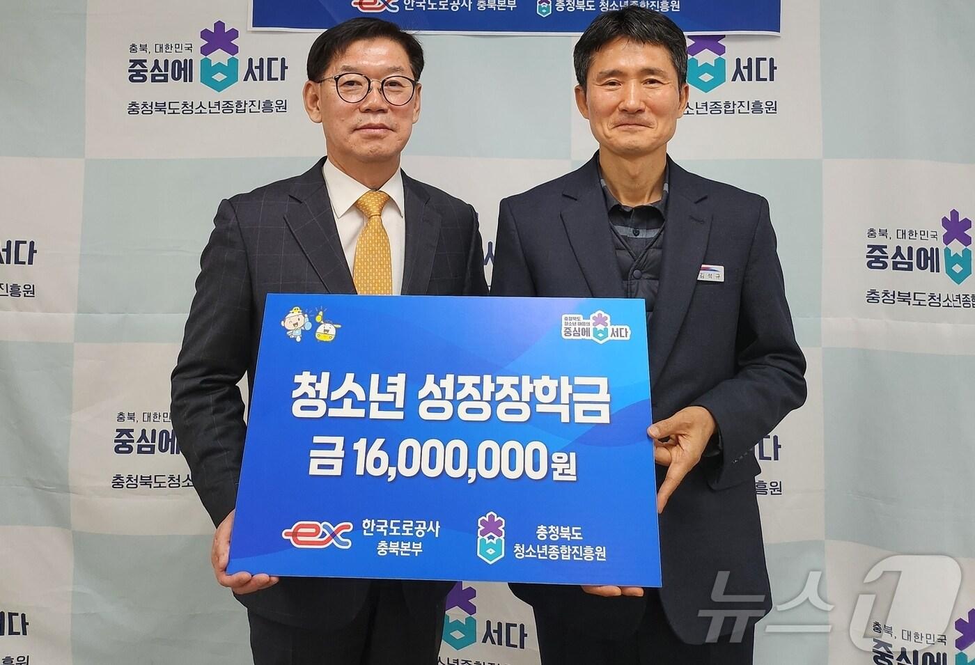 안정적 학업 위해 고등학교 졸업 때까지 후원한국도로공사 충북본부 김석규 관리처장(오른쪽)이 12일 충북청소년종합진흥원 김자중 원장에게 장학금 1600만 원을 전달하고 있다.(한국도로공사 충북본부 제공, 재판매 및 DB금지)/2025.03.12/뉴스1관련 키워드한국도로공사충북본부장학금이성기 기자 진천군 "고춧대 등 영농부산물 태우지 말고 파쇄하세요"증평군, 여성농업인 바우처 신청 다음 달 20일까지 접수관련 기사한국도로공사 충북본부, 공부방 학습 봉사 대학생 취업 멘토링도로공사 충북본부, 학습봉사 대학생에 장학금 300만원 지원