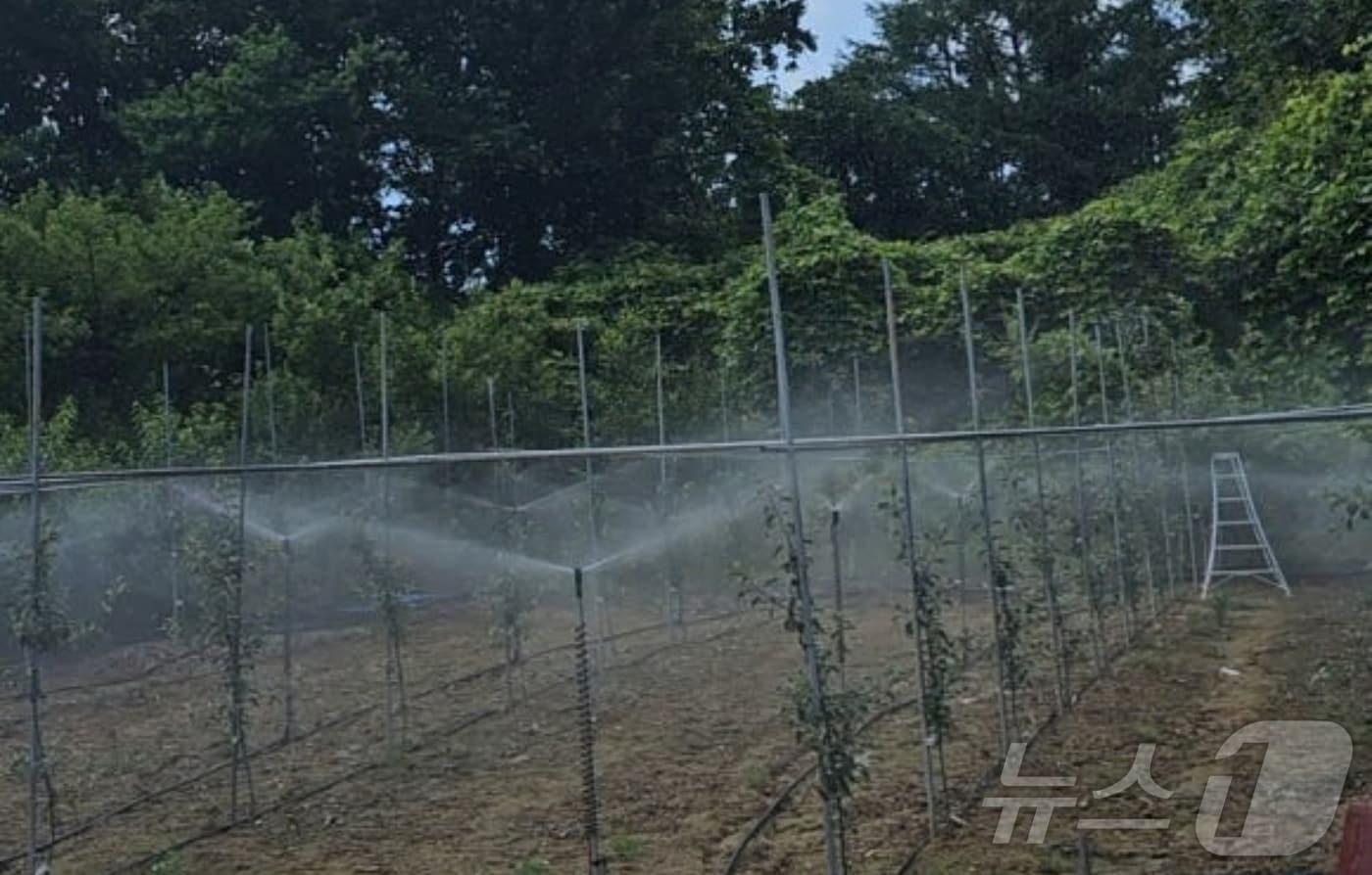 이상 기온에 의한 서리 피해 막기 위해 미세 살수장치를 가동하는 과수원 모습/뉴스1