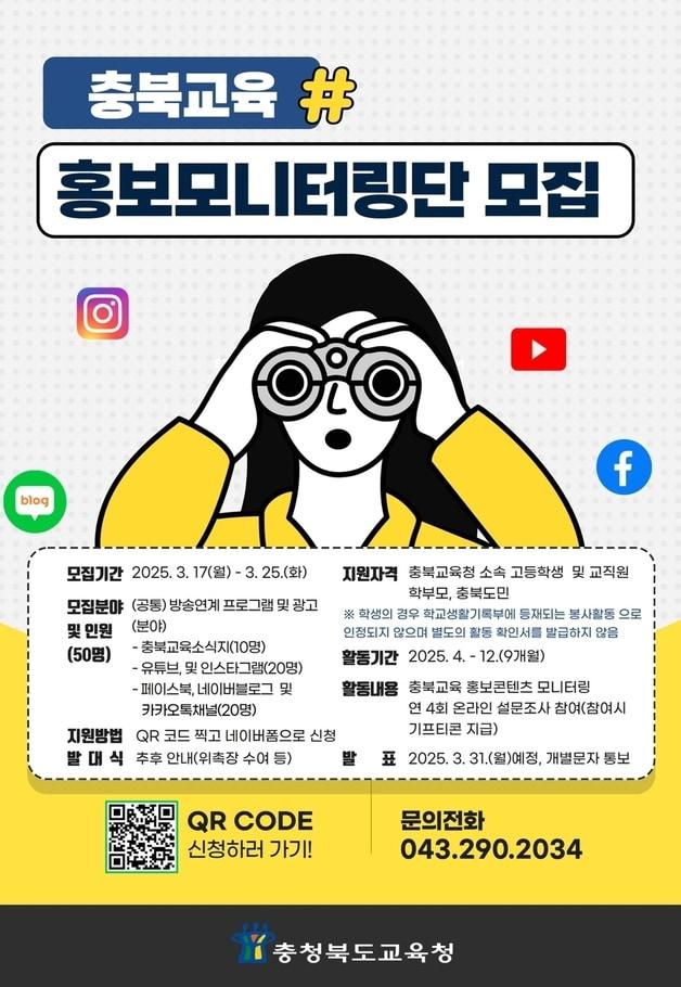 홍보콘텐츠 온라인 설문조사 참여, 수시 모니터링 활동 등충북교육 홍보 모니터링단 모집 홍보물.(충북도교육청 제공. 재판매 및 DB금지)/뉴스1관련 키워드충북교육청홍보모니터링단엄기찬 기자 청주TP 유치원·초중교 늘어난다…교육여건 개선충북교육청 평준화고 6765명 학교 배정 추첨…131명 임의배정관련 기사'충북교육 홍보 모니터링단' 출범…학생·학부모 등 53명 활동