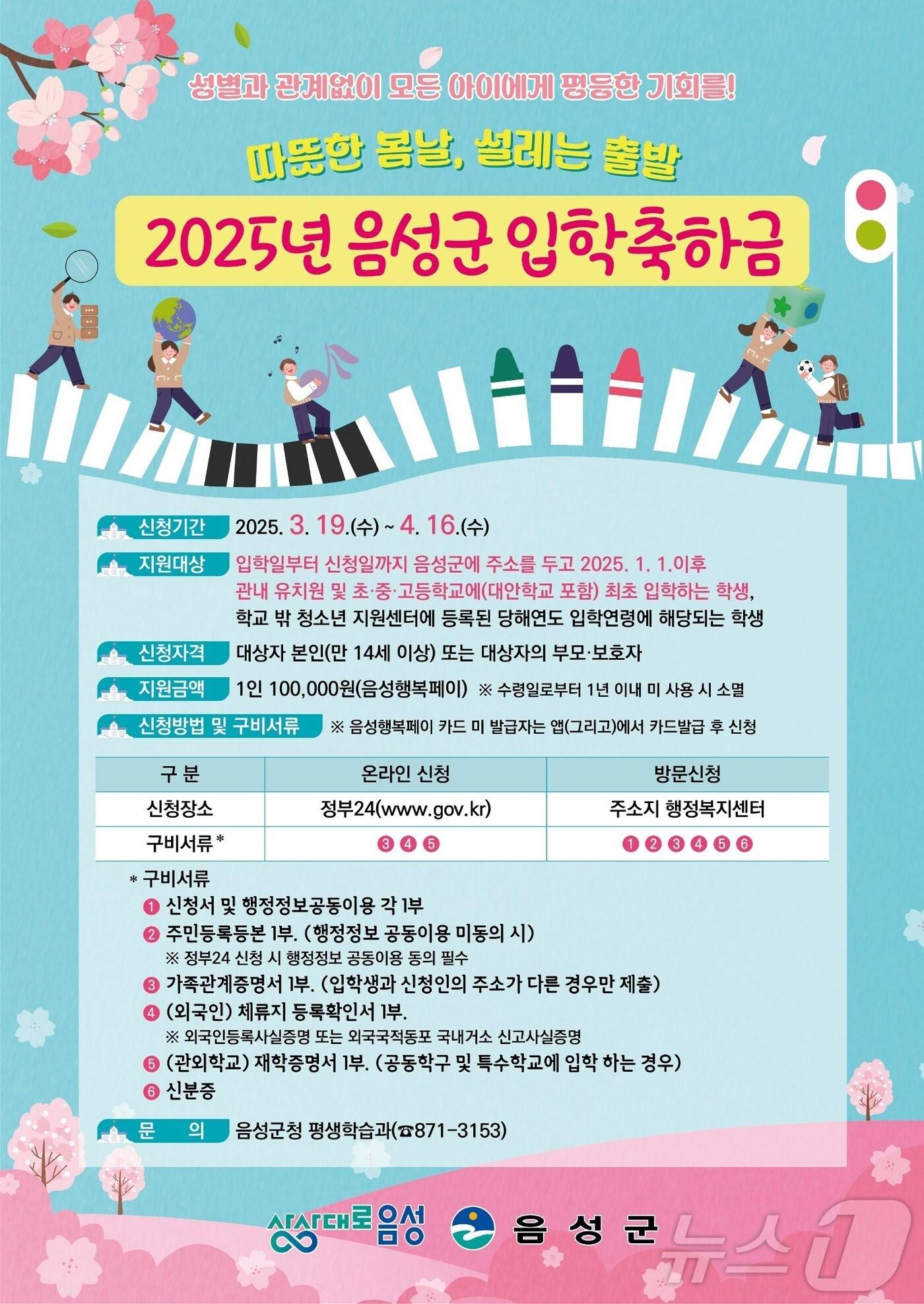 4월 16일까지 정부24 누리집에서 신청 18일 충북 음성군은 유치원, 초·중·고등학교를 입학하는 학생에게 축하금을 준다고 밝혔다. 사진은 안내문.(음성군 제공. 재판매 및 DB금지)/뉴스1관련 키워드입학축하금음성행복페이정부24학부모교육비윤원진 기자 "싸게 사 되팔아 고수익" 100억대 금 투자사기…충주 피해자만 20명'애매한 충북' 대전·충남 통합 추진에 생존 해법 찾을까