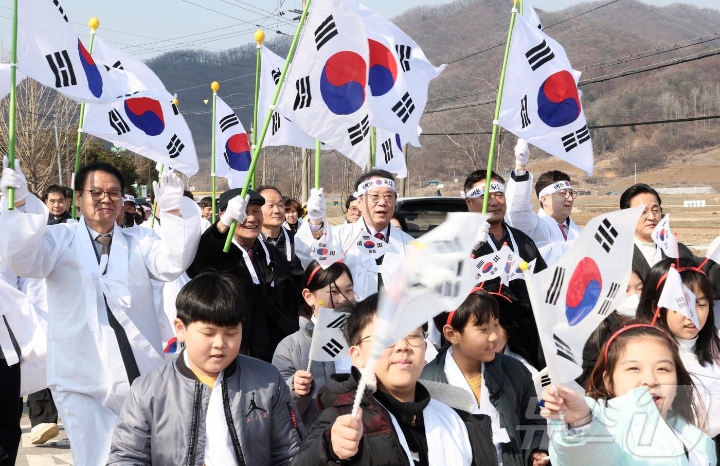 19일 오후 충북 괴산 소수면 만세운동 유적비동산에서 소수만세운동 재현 행사가 열렸다. 송인헌 괴산군수와 지역 인사, 주민 150여 명이 태극기를 들고 행진하고 있다. (괴산군 제공, 재판매 및 DB금지).2025.03.19/뉴스1 ⓒ News1 이성기 기자관련 키워드괴산군소수만세운동이성기 기자 진천종박물관 재개관, 20년의 울림 다시 시작한다쉬고, 머물고, 어울리는…증평에 어르신 전용 생활형 쉼터 열렸다관련 기사'괴산문화상' 한지장 기능보유자 안치용 씨·대한노인회 소수면분회 선정[오늘의 주요일정] 충북·세종(19일, 수)106년 전 독립운동 재현…괴산 소수서 그날의 함성 다시 울린다