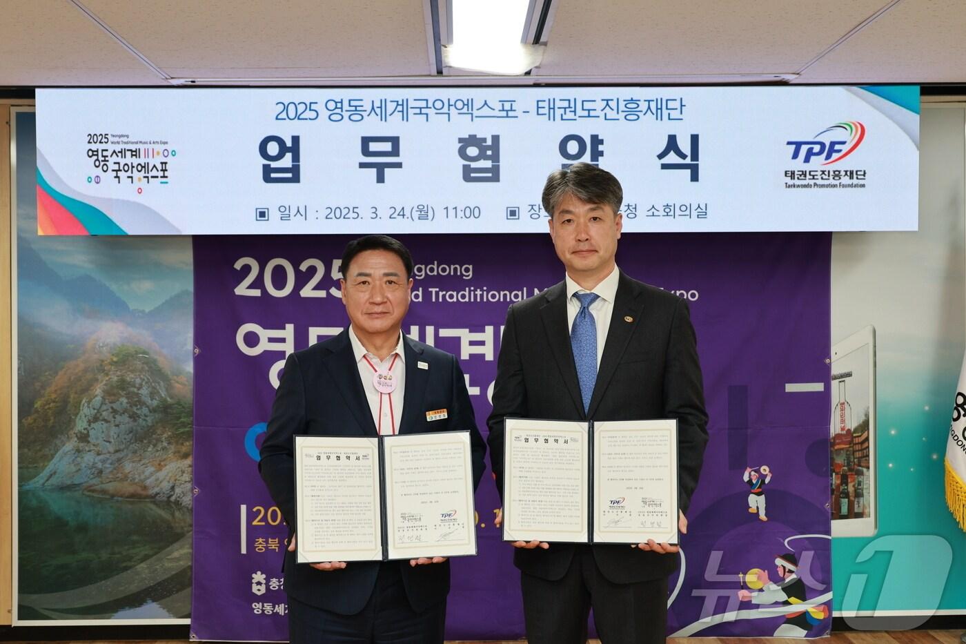 국악·태권도 진흥 상호협력 업무협약24일 정영철 영동군수(왼쪽)과 태권도진흥재단 관계자가 업무협약을 하고 있다. (국악엑스포조직위 제공. 재판매 및 DB금지) /뉴스1관련 키워드영동군영동세계국악엑스포장인수 기자 옥천 행복나눔푸드뱅크마켓 취약계층 후원액 5억원 달성영동군보건소 택시 승차대 9곳 금연구역 지정관련 기사정영철 영동군수 "'국악문화도시 NO.1' 기반 다져 나가겠다"영동군, '세계국악엑스포 개최' 등 올해 군정 10대 뉴스 발표영동세계국악엑스포조직위 해단식…국악 세계화 성과 공유영동세계국악엑스포 안전사고 '0'…군 '제로 프로젝트' 성과'국립국악원 영동분원' 건립 조사용역비 확보…공식절차 첫 발