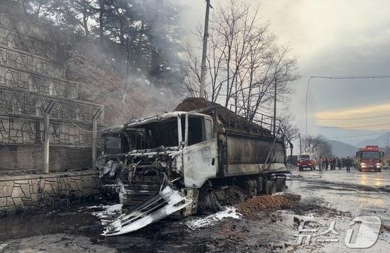 불에 탄 트럭.(단양소방서 제공/뉴스1 관련 키워드단양경찰서탱크로리 운전자.손도언 기자 제천시, 올해부터 '전상군경' 유족에게 11만원 명예수당단양군, 올해 여성농업인에게 '20만원 지원'