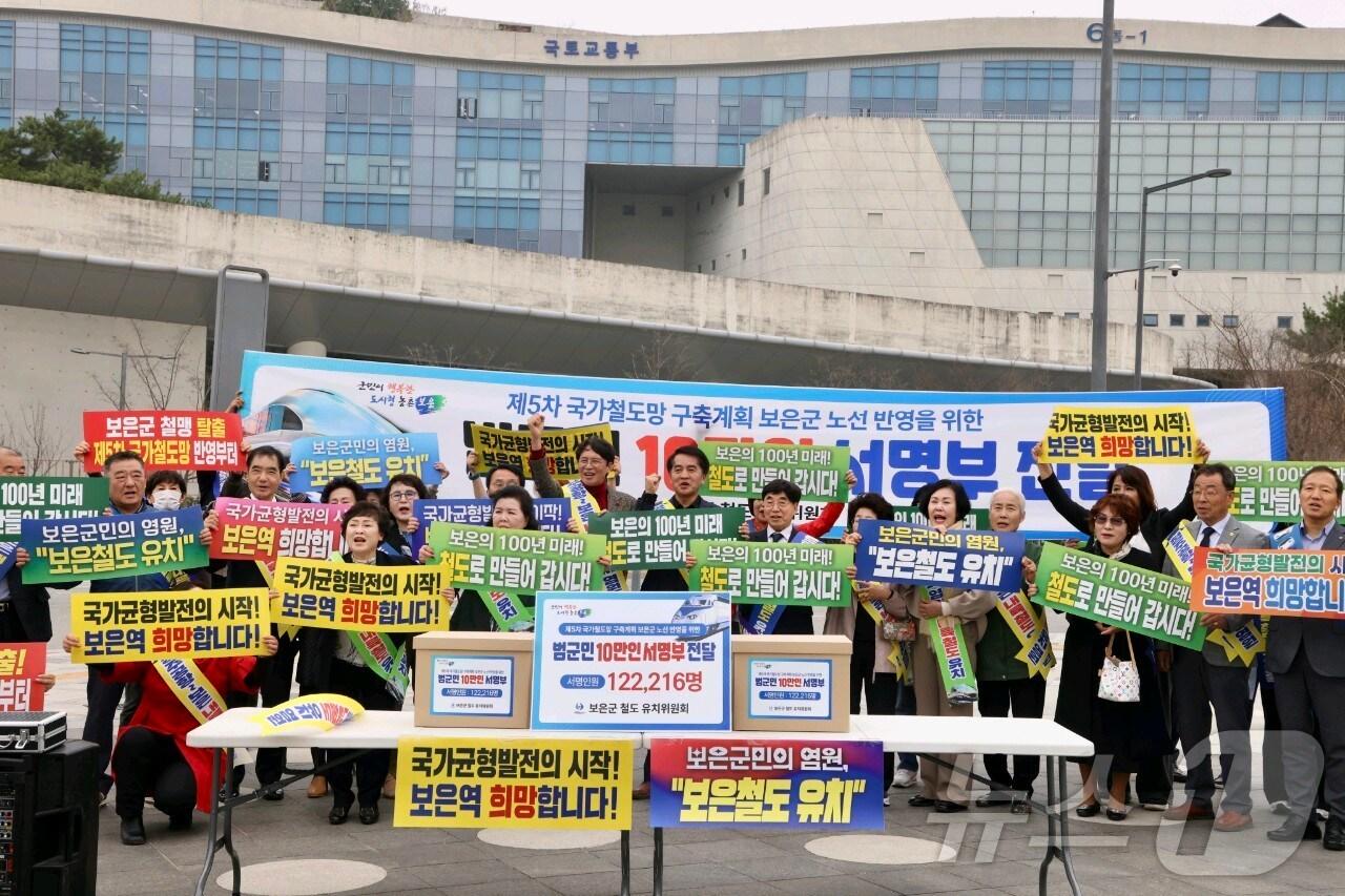 국토교통부 방문 군민의 뜻 전해27일 보은군철도유치위원회 임원 등이 정부 세종청사 앞에서 철도 유치를 촉구하는 퍼포먼스를 하고 있다. (보은군 제공. 재판매 및 DB금지) /뉴스1관련 키워드보은군철도유치장인수 기자 '청소년 복지 자산' 옥천군 꿈키움 바우처사업 호응옥천 행복나눔푸드뱅크마켓 취약계층 후원액 5억원 달성관련 기사[오늘의 주요일정] 충북·세종(7일, 수)최재형 보은군수 "도시형 정주여건 개선·생활기반 확충에 역점"[지방선거 누가 뛰나]보은군수 '보수텃밭' 표심 변화 여부 변수보은군철도유치위·청주공항공동위. 숙원사업 해결 '한뜻'충북시군의장협의회 "청주공항~김천 신설 국가철도망에 반영해야"