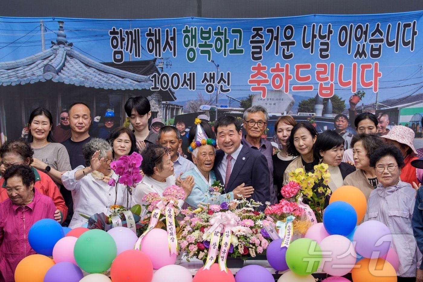 지난 19일 충북 증평군 도안면 화성3리 상작마을에 사는 김기영 어르신 100세 상수연이 열린 가운데, 김기영 할머니와 이재영 군수 등이 기념촬영을 하고 있다.(증평군 제공. 재판매 및 DB금지)/뉴스1 ⓒ News1 이성기 기자