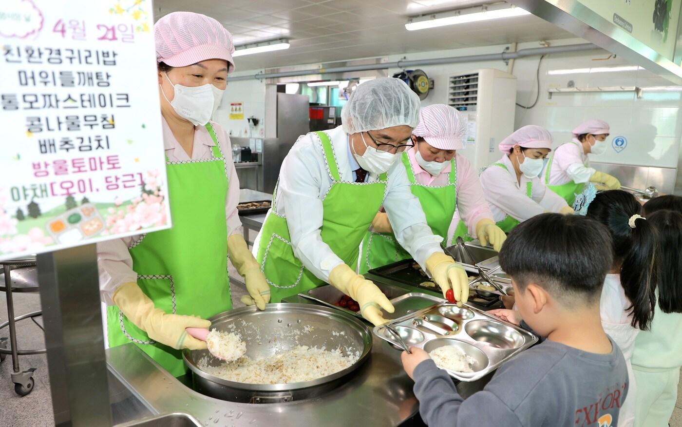 윤건영 충북교육감이 21일 '저염 식단의 날'을 운영하는 청주 덕성초등학교를 찾아 밥과 반찬을 배식하고 있다.(충북교육청 제공. 재판매 및 DB금지)/뉴스1