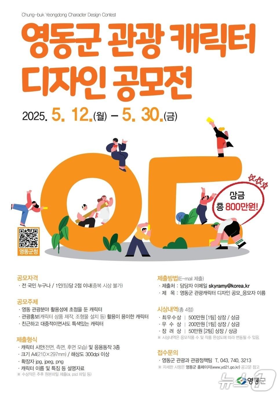 내달 12~30일 접수…최대 2점 출품 가능영동군 관광 캐릭터 디자인 공모전 홍보물 (영동군 제공. 재판매 및 DB금지) /뉴스1 관련 키워드영동군디자인공모전장인수 기자 "위장전입 내몰릴라"…옥천 기본소득 신청 망설이는 공무원들영동군 23일까지 여성농업인 특수건강검진 희망자 접수관련 기사영동군 관광 캐릭터 공모전 최우수상 '영동삼총사' 선정[오늘의 주요일정] 충북·세종(2일, 수)