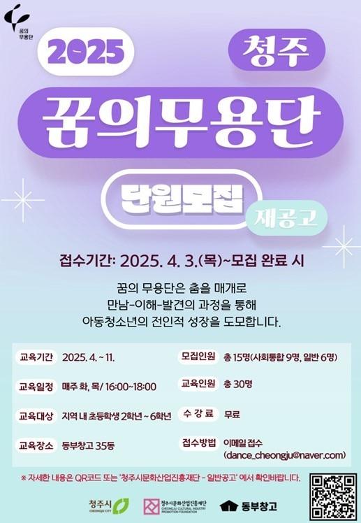 '춤씨-앗의 성장 대모험' 주제 11월까지 매주 2회 프로그램 운영꿈의 무용단 청주 단원 모집 포스터.(한국교원대학교 제공. 재판매 및 DB금지)/뉴스1관련 키워드한국교원대학교꿈의무용단청주춤엄기찬 기자 충북학습종합클리닉 청주센터 '겨울방학 꿈자람 프로그램' 운영충북대박물관-전곡선사박물관 '한국선사문화 대중화' 업무협약