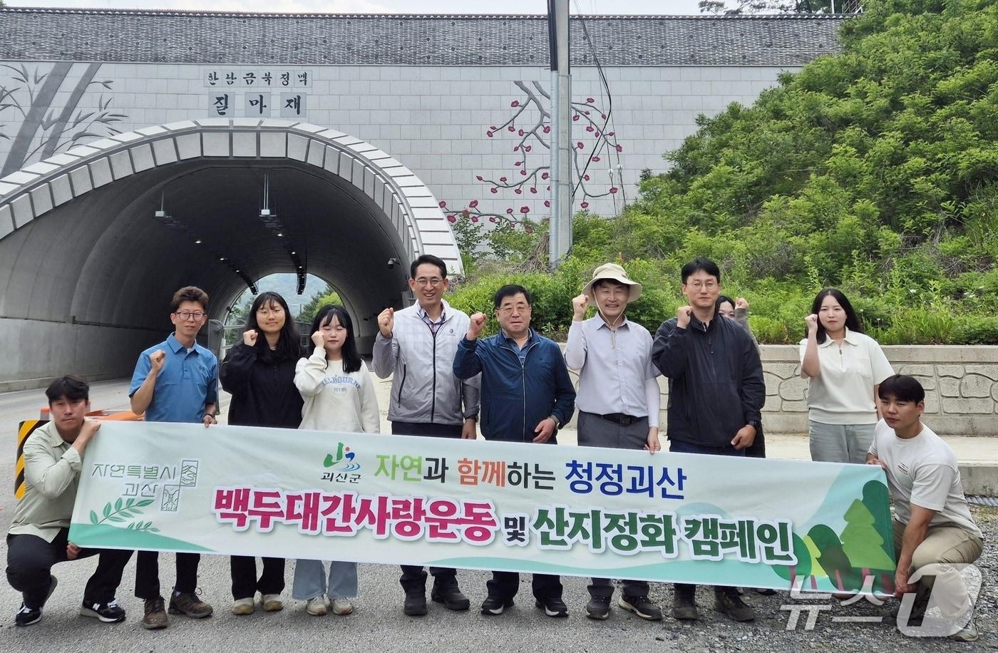 충북 괴산군은 산림환경 보호와 건전한 산행문화 정착을 위해 한남금북정맥 질마재 일원에서 '백두대간 사랑운동 및 산지 정화 캠페인'을 했다.(괴산군 제공, 재판매 및 DB금지)/뉴스1