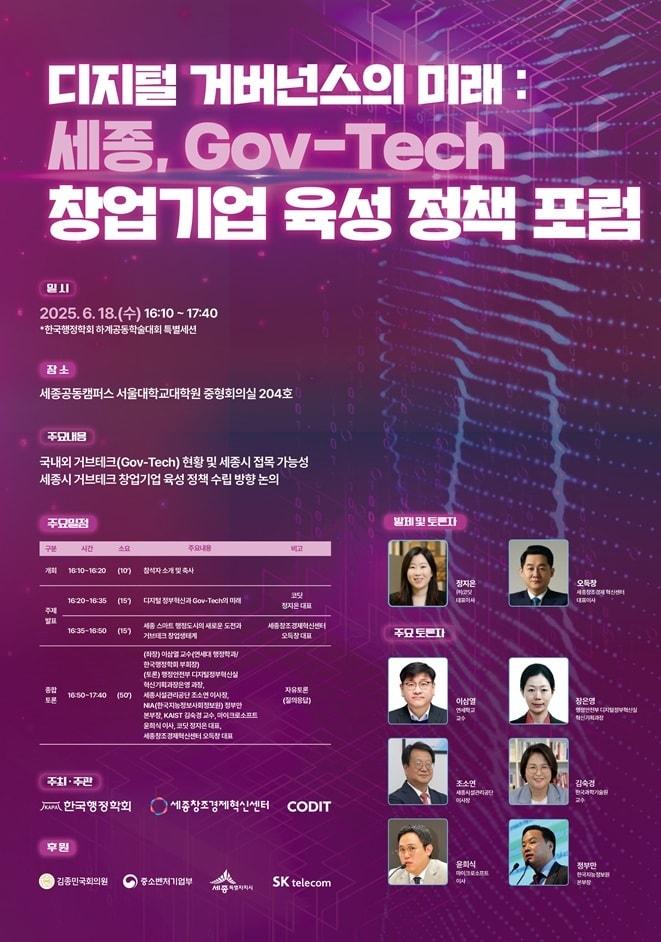 창조경제혁신센터·코딧 공동 주관 세종공동캠퍼스서'세종, 거브테크(Gov-Tech) 창업기업 육성 정책 포럼' 포스터. / 뉴스1 관련 키워드거브테크포럼세종공동캠퍼스한국행정학회장동열 기자 2026 새해 첫날 세종호수공원서 '해맞이 행사' 개최세종시 토목직 공무원 17명, 방재전문인력 시험 전원 합격