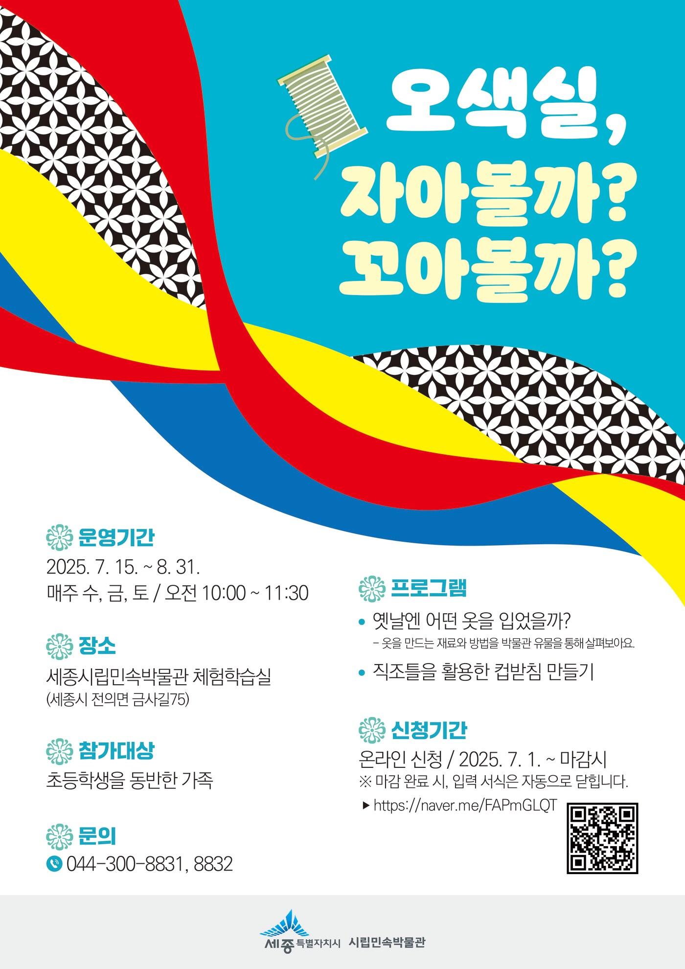 여름방학 맞아 초등학생 대상 체험 프로그램 운영여름 방학 프로그램 포스터. (세종시립민속박물관. 재판매 및 DB금지)관련 키워드의복만들기체험프로그램세종시립민속박물관장동열 기자 세종 15~39세 청년 95.5% 타지역서 전입…1인가구 32%[오늘의 날씨] 충북·세종(31일, 수)…제천 –10도 올 마지막 날 한파