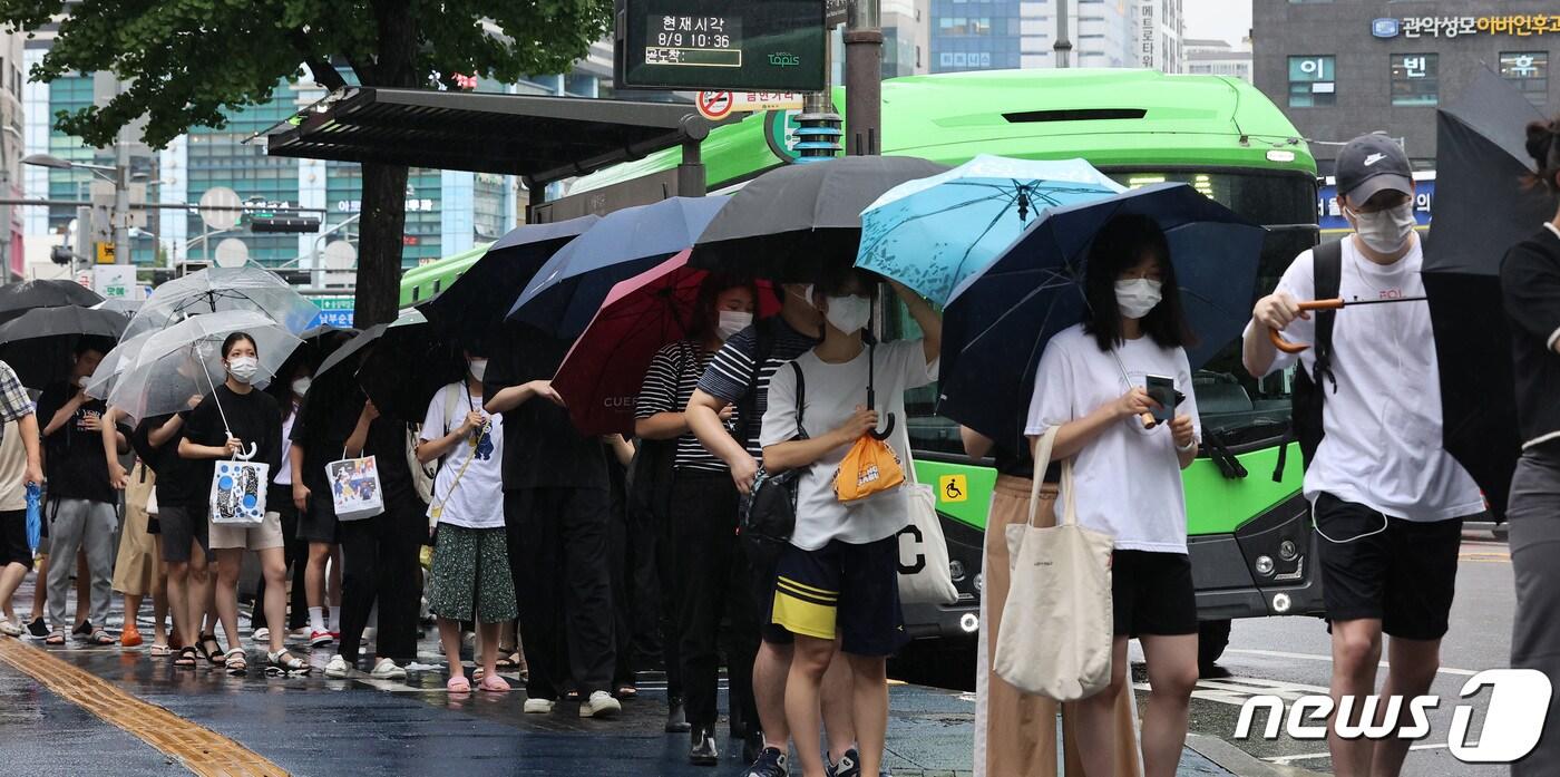 수도권과 중부지방을 중심으로 폭우가 내린 다음 날인 9일 서울 관악구 서울대입구역 인근 버스 정류장에서 시민들이 버스를 타기 위해 대기하고 있다. 전날 내린 폭우로 선로 일부가 물에 잠기며 지하철 일부 노선 운영이 중단돼 서울 시내 곳곳에서는 지하철 대신 버스를 타기 위해 인파가 몰렸다. 2022.8.9/뉴스1 ⓒ News1 조태형 기자