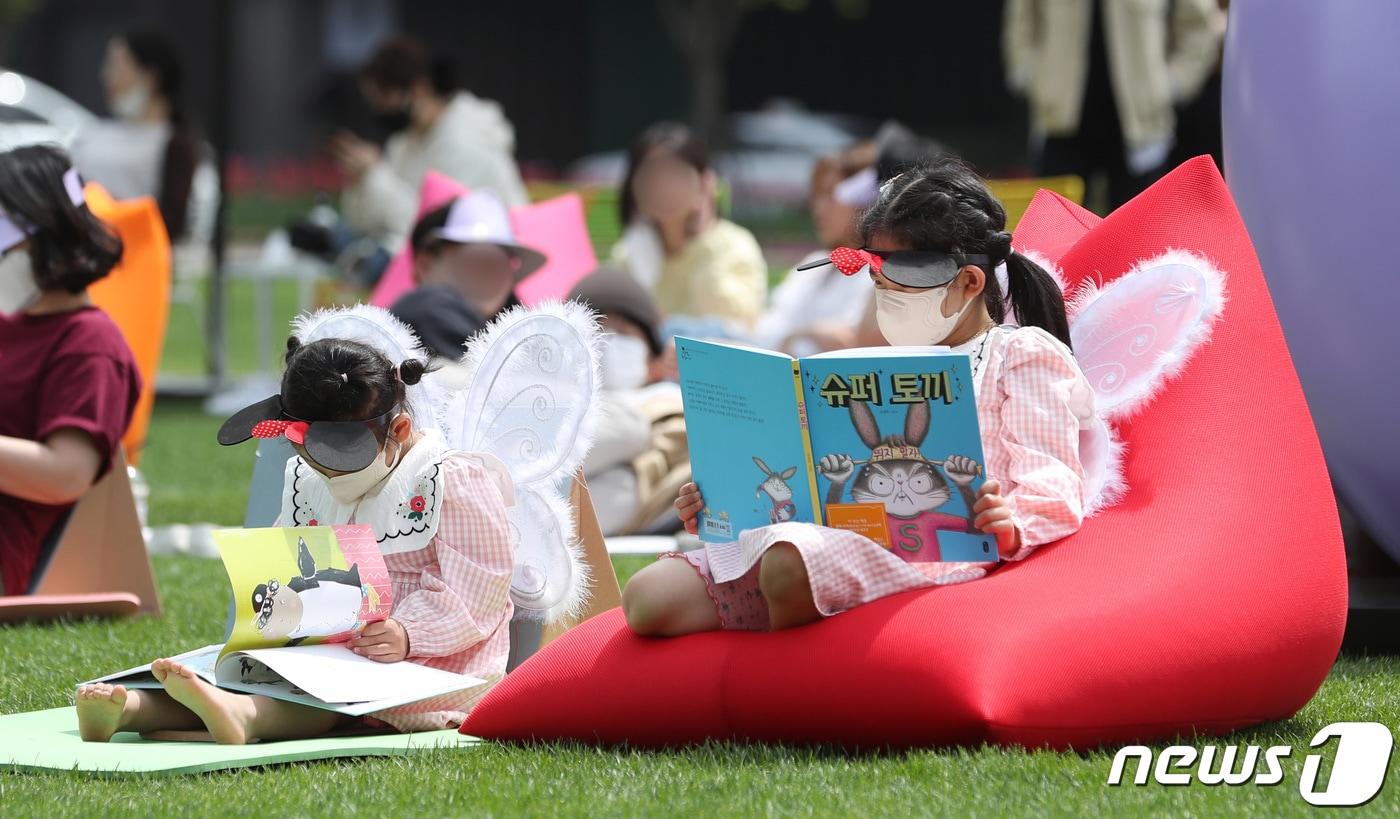 지난 4월23일 서울광장에 설치된 야외도서관 '책 읽는 서울광장'에서 아이들이 잔디에 앉아 책을 읽고 있다. 2022.4.23/뉴스1 ⓒ News1 이성철 기자