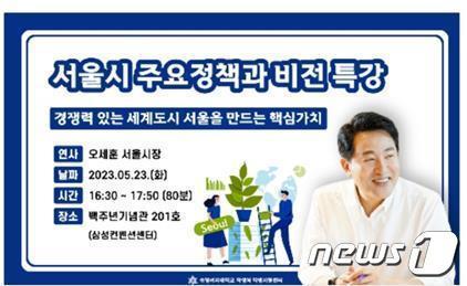 약자와의 동행·기후변화 글로벌 선도도시 등 시정 주요 가치 소개(숙명여대 홈페이지 제) 관련 키워드오세훈서울시장숙명여대제로캠퍼스권혜정 기자 서울시, 초미세먼지 기원 잡아낸다…국외 발생 산불 기인 성분 확인[동정] 오세훈, 병오년 새해맞아 국립서울현충원 참배관련 기사서울시, AI인재 양성 박차…"초급부터 최고급까지 단계별 육성"'인구 변화 선제적 대응…서울시, 인구정책위 확대 구성