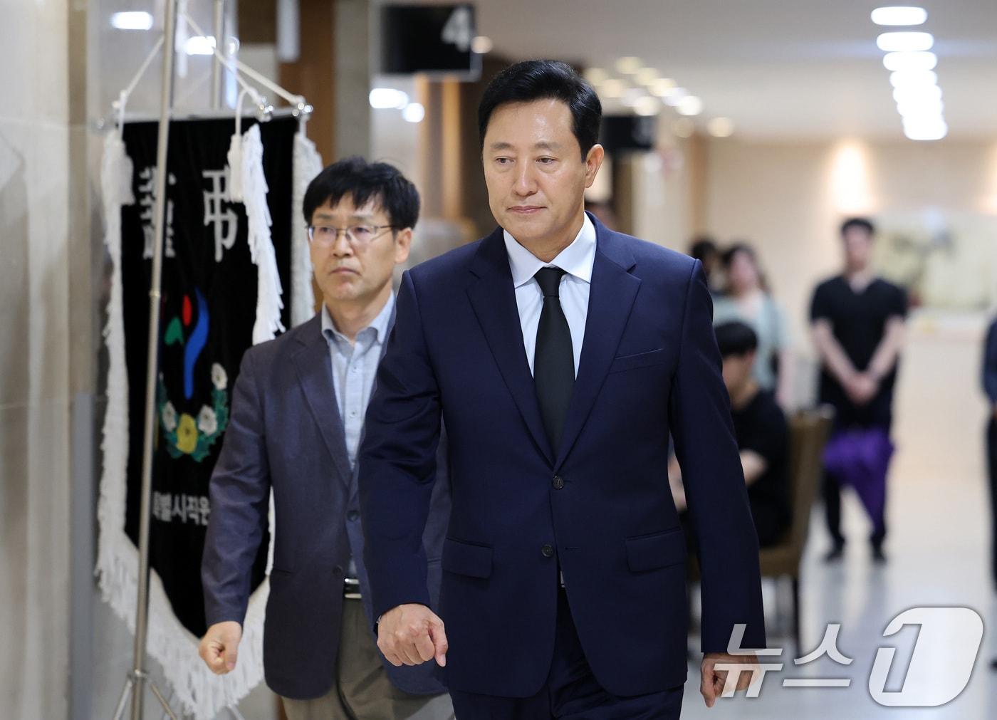 오세훈 서울시장이 2일 오후 시청역 인근 사거리에서 전날 대형 교통사고로 숨진 서울시청 공무원 윤모(31)씨 빈소가 차려진 서울 서대문구 신촌세브란스 장례식장을 찾아 조문을 마친 뒤 이동하고 있다. 서울시 세무과 소속 윤모(31) 주임은 연말 6급 승진이 유력했던지라 안타까움을 더하고 있다. 2024.7.2/뉴스1 ⓒ News1 박지혜 기자