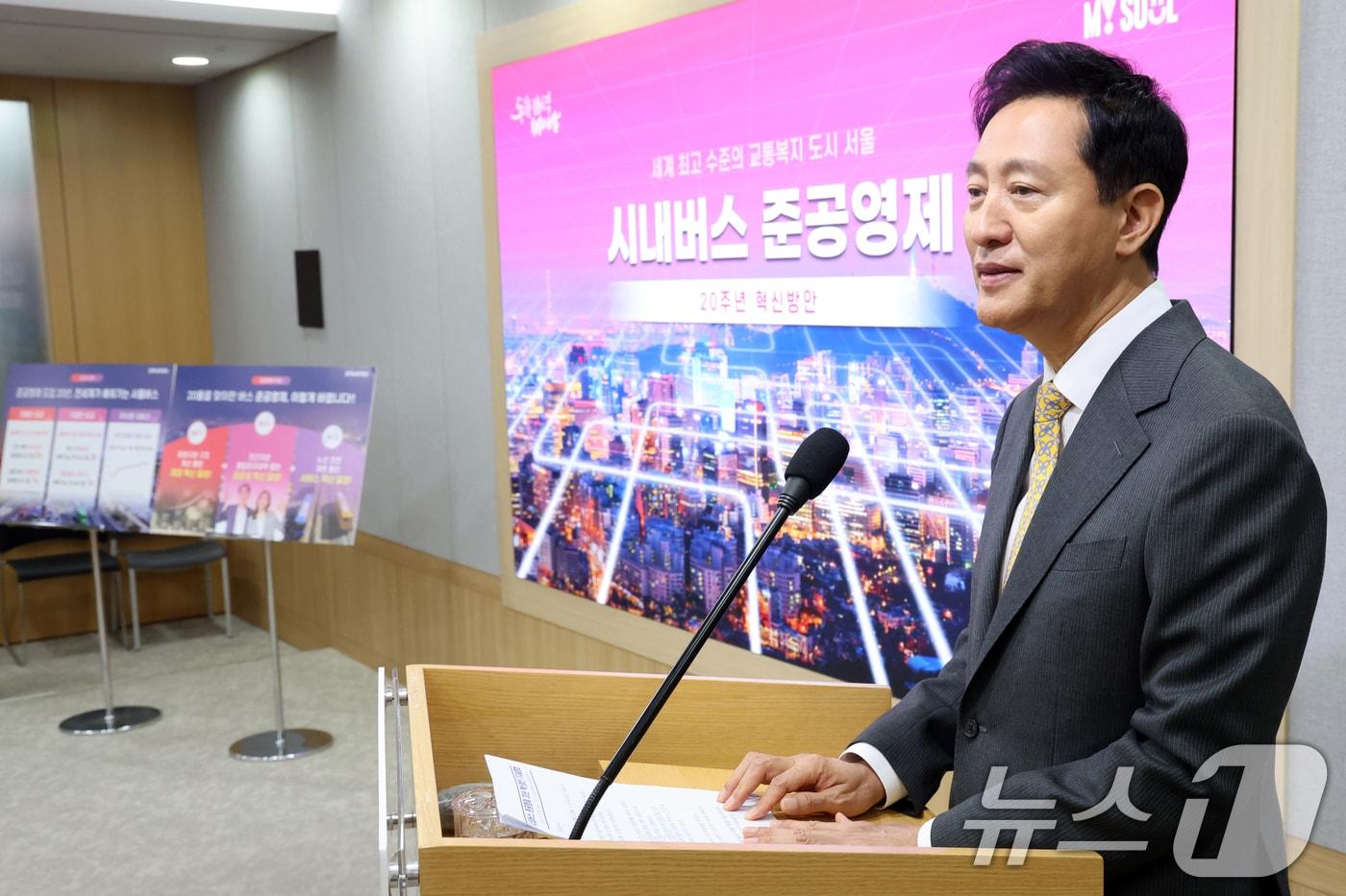 오세훈 서울시장이 22일 오전 서울시청 브리핑룸에서 '시내버스 준공영제 20주년' 혁신 방안을 발표하고 있다. 서울시는 이날 브리핑을 통해 20년 만에 버스노선도를 전면 개편한다고 밝혔다. 복잡했던 시내버스 노선은 간소화하고, 장거리나 중복된 노선은 줄인다. 오랜 재정 부담 완화를 위해 운송수지 적자분 전액을 보전해주던 '사후정산' 방식에서 미리 정한 상한선 안에서 보전하는 '사전 확정제'로 바꾼다. 2024.10.22/뉴스1 ⓒ News1 황기선 기자