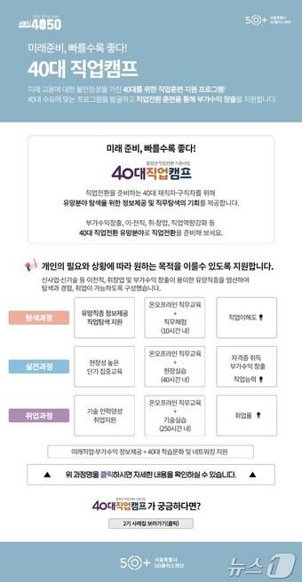5일부터 탐색과정 참여자 모집…40대 서울시민 누구나(서울시50플러스재단 제공) 관련 키워드서울시50플러스재단직업캠프40대서울시권혜정 기자 타종부터 미디어아트쇼까지…서울 곳곳 '새해맞이 카운트다운'오세훈 "서울, 더 따뜻하고 더 다정한 도시 될 것…멈추지 않고 성장"관련 기사서울시, 40대 대상 직업캠프 운영…275명 재취업 지원서울시, 에어컨 설치·보일러 관리 기술자 양성 무료 교육