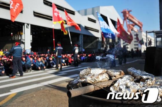 현대중공업 노조가 30일 네번째 부분파업을 벌인 가운데 파업집회 현장에 군고구마가 등장해 눈길을 끌고 있다.ⓒ News1 조창훈 기자30일 네번째 부분파업 집회 전경ⓒ News1 조창훈 기자