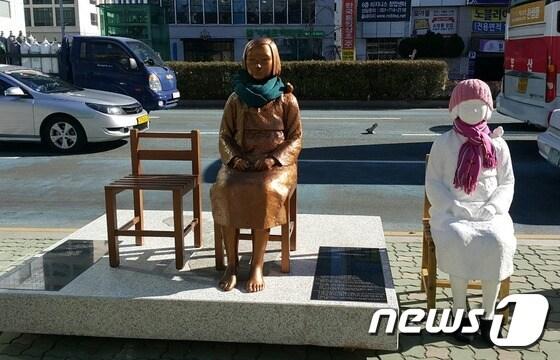 부산 일본영사관 앞에서 설치됐다가 동구청의 강제 철거로 압수된 소녀상이 지난해 12월30일 오후 부산 동구 일본영사관 앞 인도에 다시 설치돼 있다. 동구청은 소녀상을 압수한 지 이틀 만인 이날 소녀상을 반환했다. 비난 여론이 거세지자 동구청은 자체 회의를 거쳐 소녀상 반환을 결정한 것으로 전해졌다./뉴스1 ⓒ News1