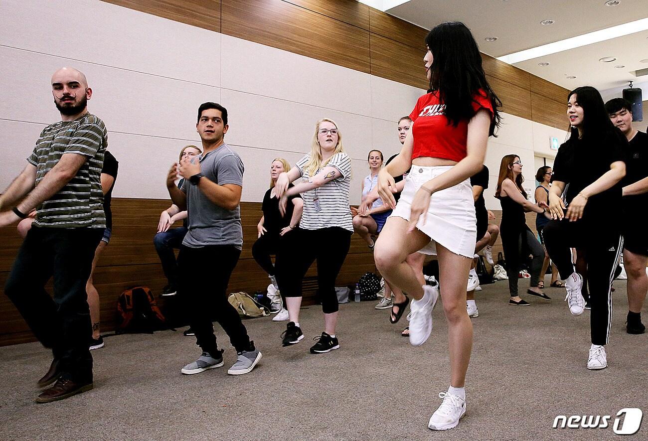 지난 10일 울산대 국제관에서 UIP 참가자들이 한국학생들로부터 K-팝 댄스를 배우고 있다.(울산대학교 제공)ⓒ News1