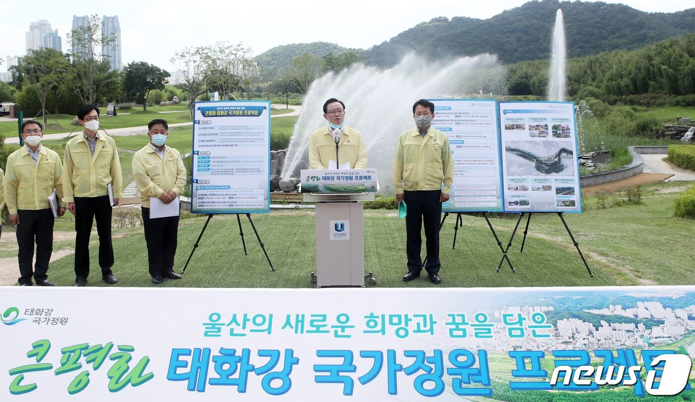 울산시 13차 뉴딜사업 발표…2025년까지 수상공중공원 등 조성송철호 울산시장이 16일 오전 울산 태화강 국가정원 오산못에서 태화강 국가정원 인프라 확충과 관광 활성화 계획을 담은 '큰 평화, 태화강 국가정원 프로젝트'에 대해 브리핑하고 있다. 울산시는 이날 2025년까지 대한민국 2호 국가정원인 태화강 국가정원에 백리대숲 스카이워크, 수상 공중 정원, 랜드마크로 남산 전망대 등을 조성할 계획이라고 밝혔다. 2020.7.16/뉴스1 ⓒ News1 윤일지 기자