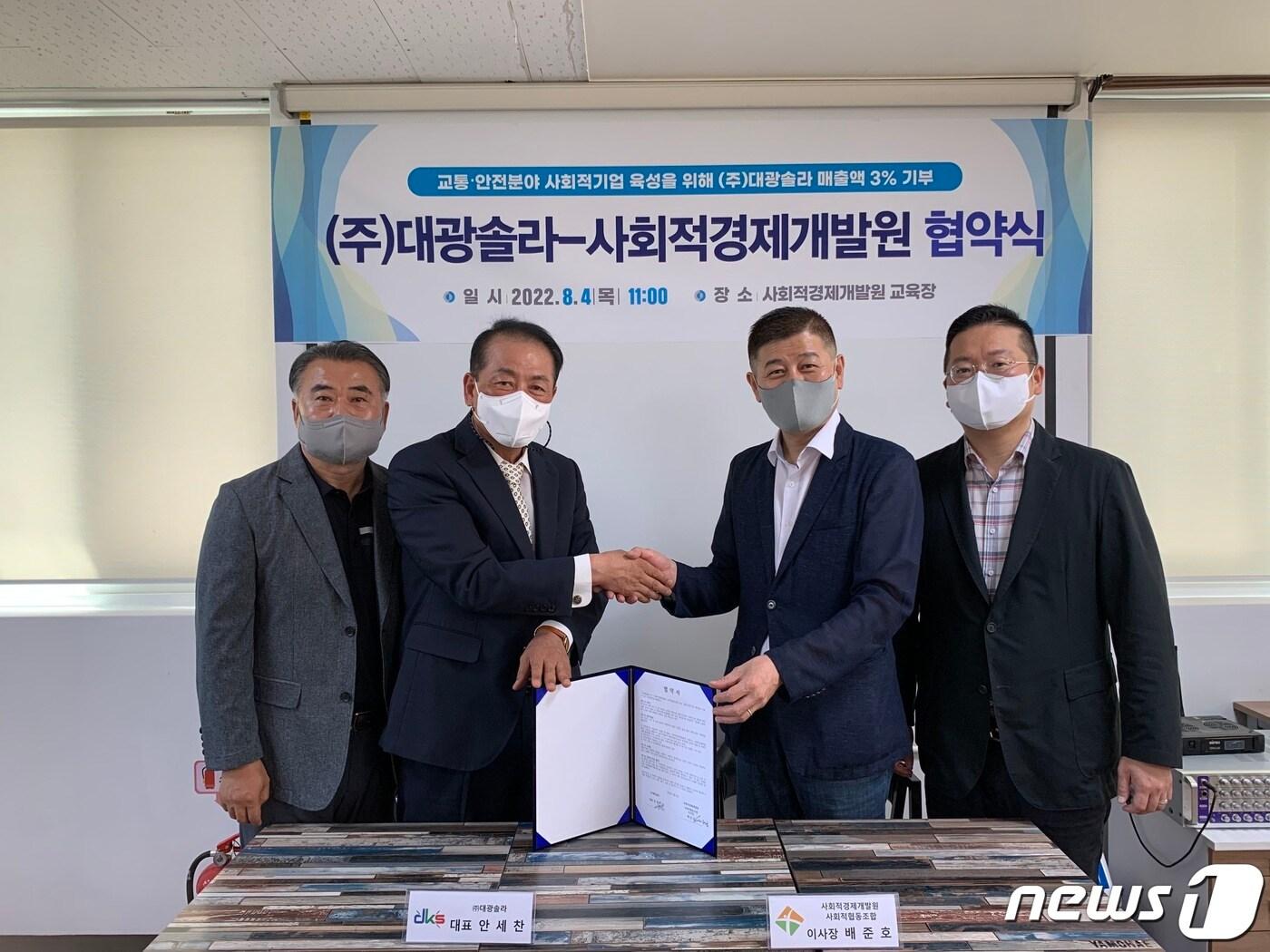 교통·안전사고 예방과 관련된 사회적기업 육성을 위한 업무 협약식에서 ㈜대광솔라 장재광 부사장(왼쪽부터), 안세찬 대표이사, 사회적경제개발원 배준호 이사장, 울산사회적기업협의회 안태진 회장이 기념촬영을 하고 있다.ⓒ 뉴스1