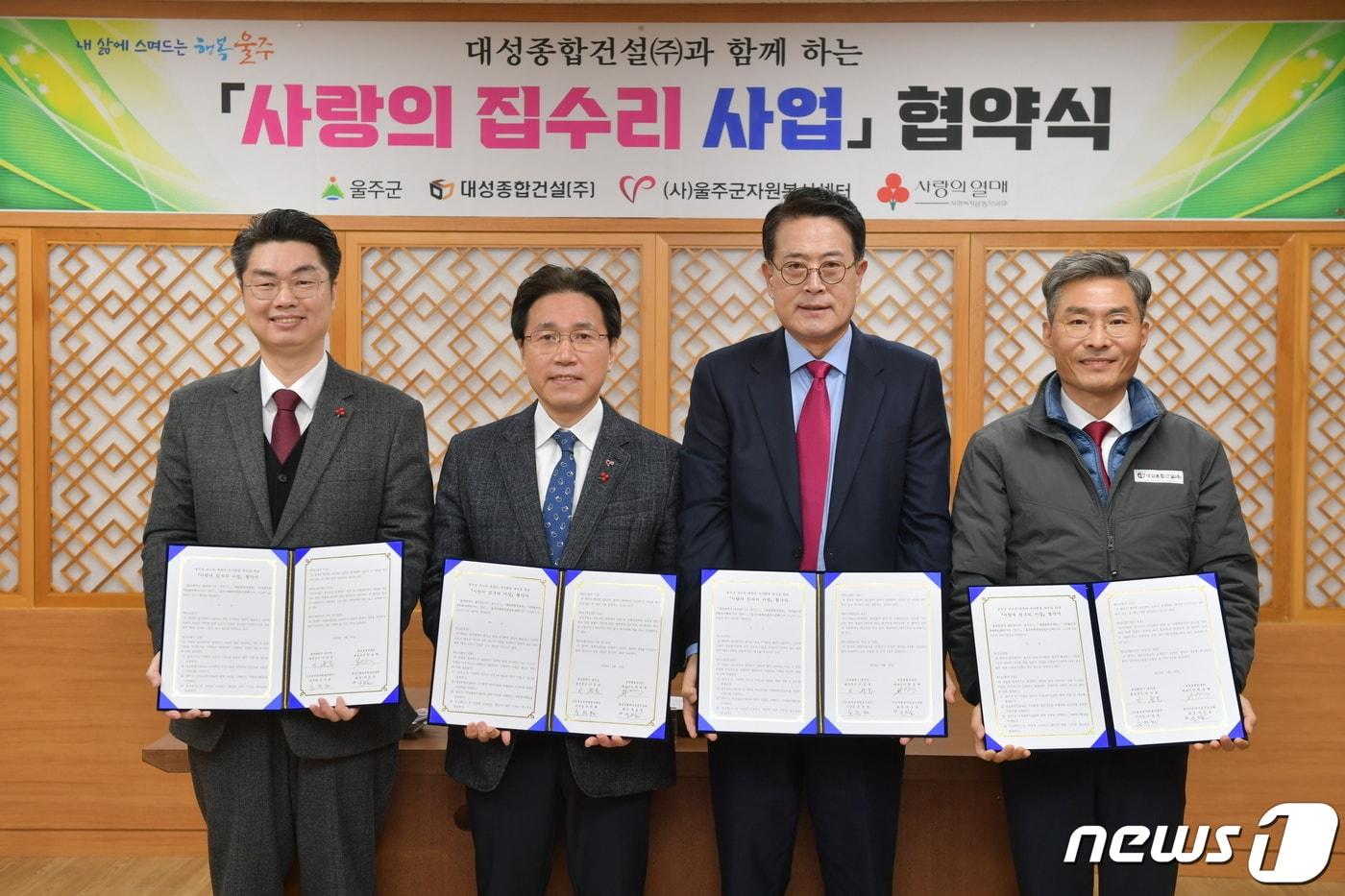 울산시 울주군과 대성종합건설㈜이 22일 군청 은행나무홀에서 이순걸 울주군수와 대성종합건설㈜ 최동혁 대표이사, (사)울주군자원봉사센터 손덕현 이사장, 울산사회복지공동모금회 조진호 사무처장 등 관계자들이 참석한 가운데 ‘사랑의 집수리 사업’ 협약을 맺었다.