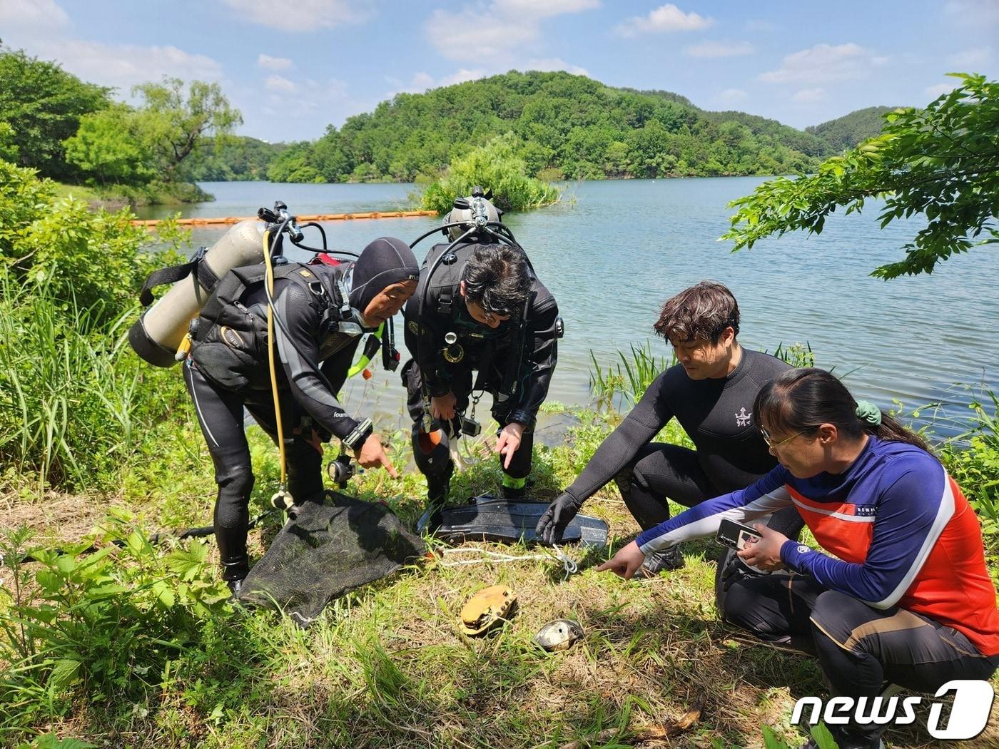 잠수협회 울산남구지부 회원들이 20일 선암호수공원에서 포획안 붉은귀거북을 살펴보고 있다. (울산 남구청 제공)
