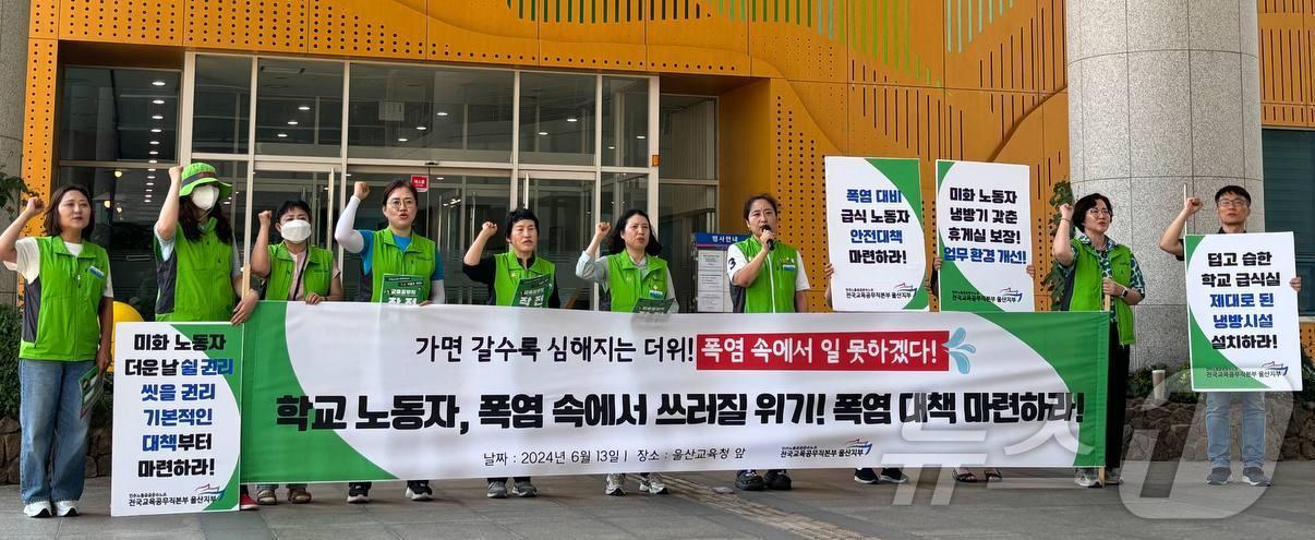시교육청 "청소 근로자 휴게실, 급식시설 냉방시설 100% 설치"민주노총 공공운수노조 전국교육공무직본부 울산지부 조합원들이 13일 울산시교육청 앞에서 기자회견을 하고 있다. (울산 교육공무직 노조 제공)관련 키워드폭염 대책조민주 기자 '일출 1번지' 울산 간절곶서 해맞이 행사…드론쇼·불꽃쇼도2028울산국제정원박람회 특별법, 국회 법사위 통과관련 기사진천군, 행안부 기후재난 대응 폭염 분야 우수기관 선정증평군, 기후재난 대응 우수 지방정부 선정…가뭄 대응 전략 인정계약종료 앞둔 청와대 하청노동자 일자리 어떻게 되나울산 동구 '기후 재난대응 평가' 우수 지자체 인센티브 받아충남도 '세이프존' 등 정책 우수성 인정…특교세 4억5000만원 확보