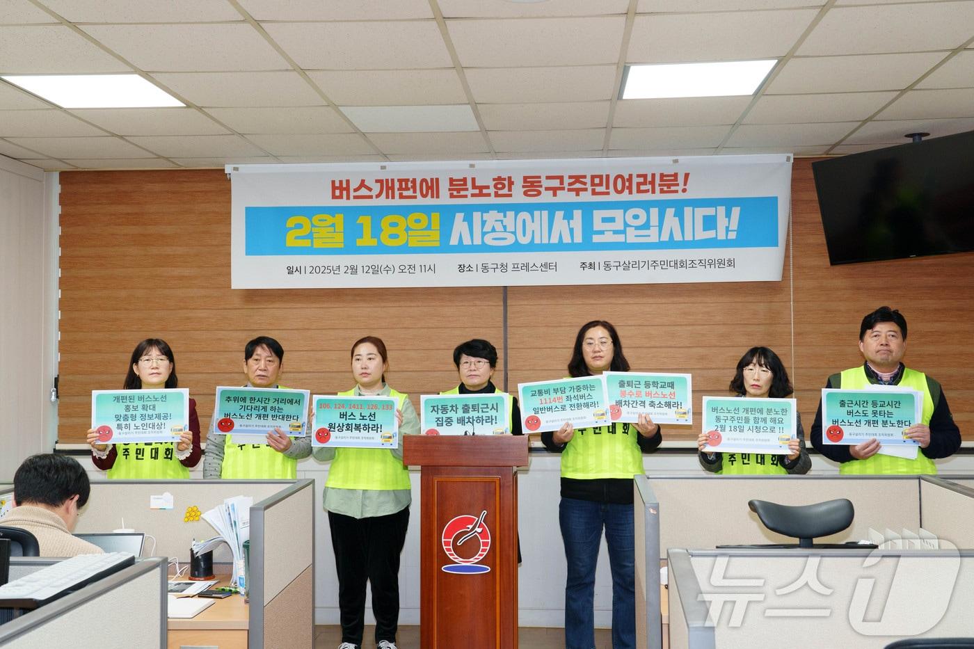 "서울처럼 촘촘해야…울산 특성 감안하라"울산 동구살리기주민대회조직위원회는 12일 구청 프레스센터에서 울산시 버스노선 개편 불편사항에 대한 회견을 열었다. (울산동구살리기주민대회조직위원회 제공. 재판매 및 DB금지)관련 키워드울산울산동구울산동구청울산버스관련 기사울산 동구 "작년 국가 공모사업 17개 선정…1039억원 확보"[오늘의 주요일정] 울산(15일, 목)울산 동구 남목청소년센터 10년 연속 '최우수기관' 선정민주당 "울산대교 통행료, 동구민은 50% 인하하자"…시 "재정에 부담"김태선, 17일 울산 동구청서 의정 보고회