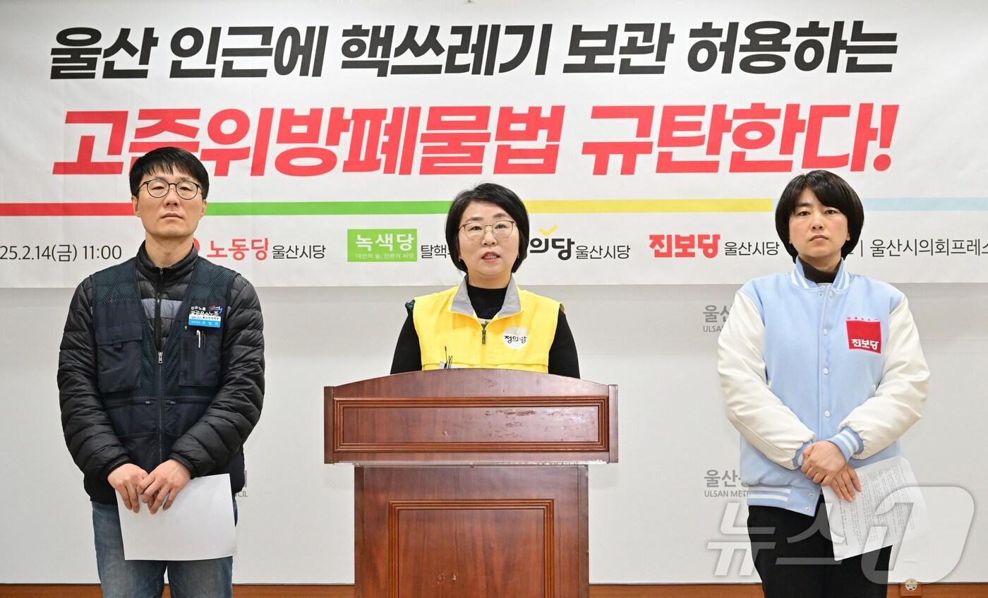 울산 노동당, 정의당, 진보당, 녹색당이 14일 오전 기자회견을 열고 "국민의힘과 민주당은 울산 인근 핵쓰레기 보관 허용하는 고준위방폐물법 거래시도 지금 당장 중단하라"고 밝혔다.(울산시의회 제공. 재판매 및 DB 금지) /뉴스1관련 키워드울산울산시의회진보당노동당정의당녹색당김세은 기자 울산 북구, 행안부 재정분석 종합등급 '나' 획득[오늘의 날씨] 울산(16일, 금)…대기 건조, 일교차 커관련 기사윤종오 "울산 건설기계 주차·수리·검사 복합센터 건립해야"[오늘의 주요일정] 정치·정부 (14일, 수)"울산시민 통합돌봄 수요조사 '모든 사람에 제공' 55.1%"울주군수 선거 구도 윤곽…여야 후보군 잇단 출마 채비김종훈 동구청장, 울산시장 출마 선언…"부울경 일자리 동맹"