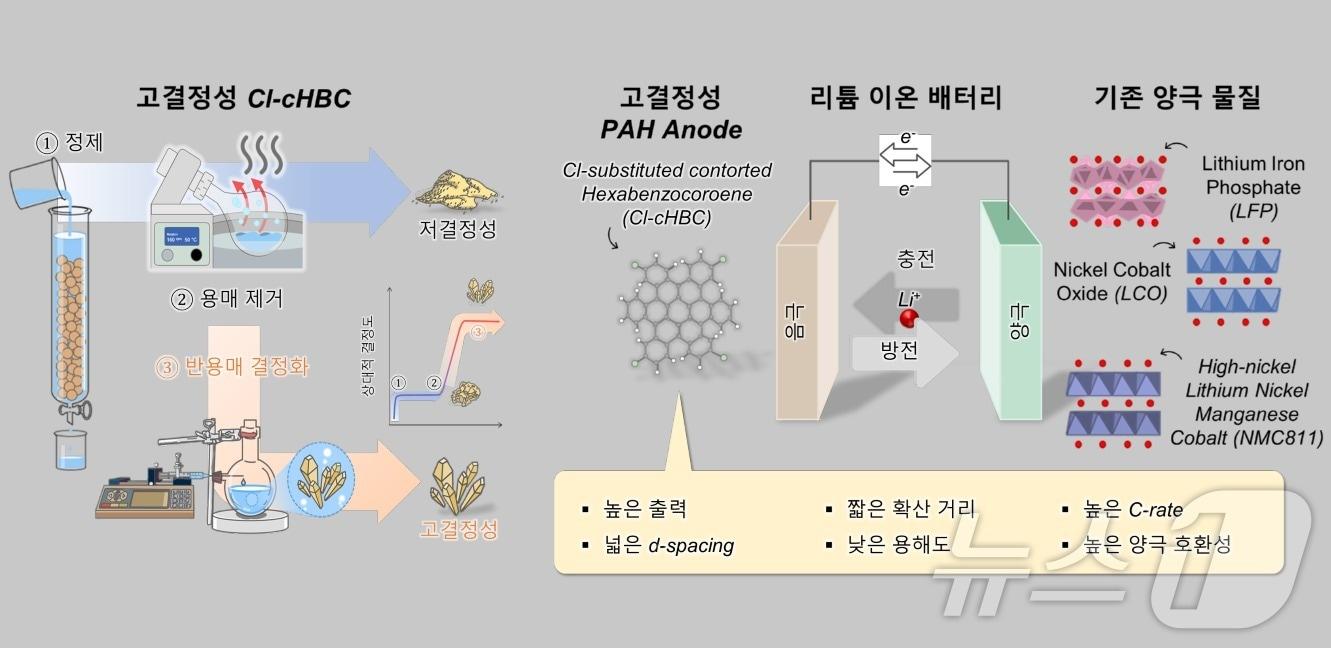 반용매 결정화 기술로 합성된 고결정성 유기 음극 소재와 개발된 음극의 장점. (UNIST 제공. 재판매 및 DB 금지) /뉴스1관련 키워드리튬이온배터리조민주 기자 울주군 가축분뇨 처리시설 존폐 위기…군의회 "대책 마련하라"울산시설공단, '서비스품질우수기업' 인증관련 기사SK온, 바인더 신소재 개발 성공…전고체 배터리 상용화 앞당긴다포스텍, '나트륨 이온전지 수명 연장' 새 기술 개발상주서 '전기차 배터리 소재' 양산…"이차전지 생산 거점 도약"KGM커머셜, 국내 최초 7m급 저상 전기버스 인증…차명 'E-STANA'SK온·서울대, 고밀도 '단결정 양극재' 개발 성공…배터리 성능 향상