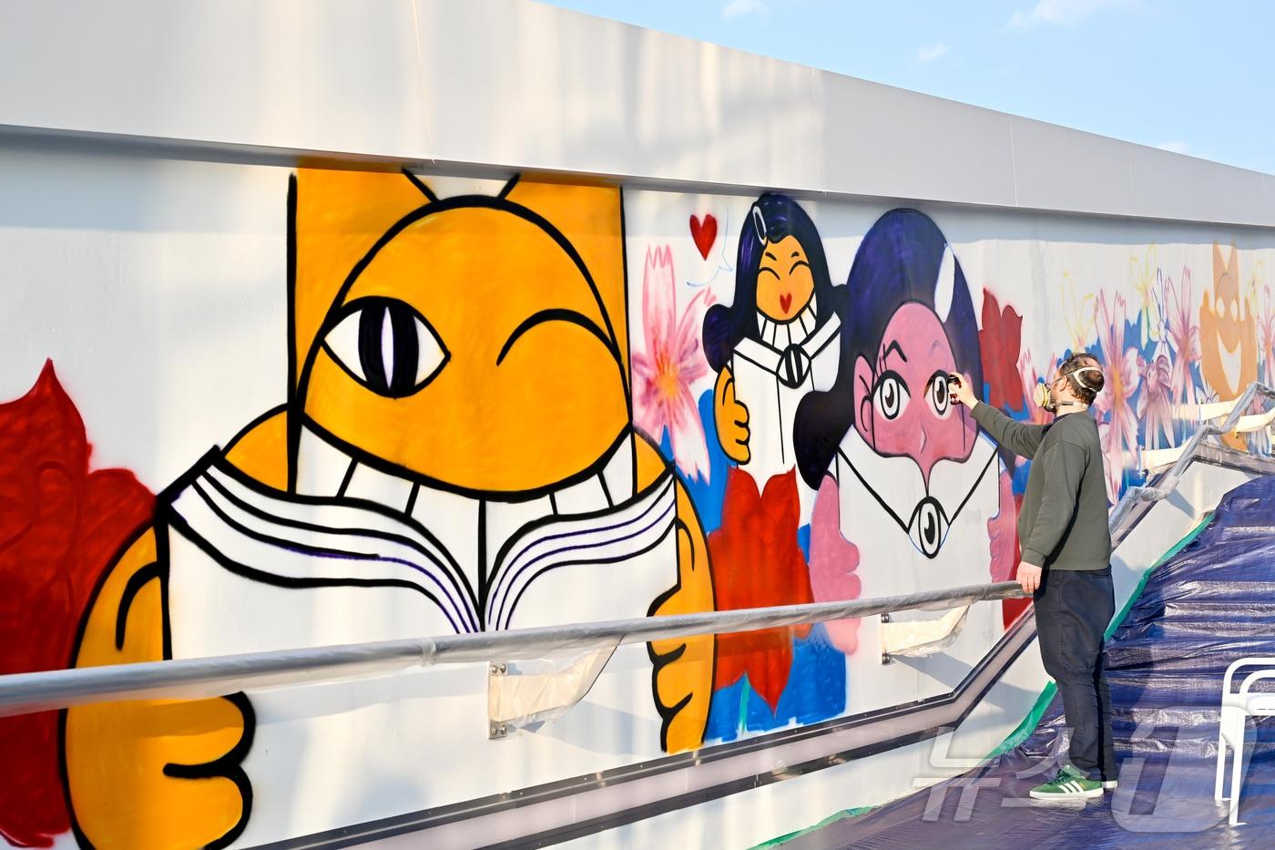 토마 뷔유가 21일 울산 중구 울산종갓집도서관 외부 계단 벽면에 그림을 그리고 있다. (울산 중구 제공. 재판매 및 DB 금지) /뉴스1관련 키워드무슈샤조민주 기자 울주군 가축분뇨 처리시설 존폐 위기…군의회 "대책 마련하라"울산시설공단, '서비스품질우수기업' 인증관련 기사노을빛 물든 울산 장생포… 예술 입은 '색채마을'로 재탄생풀무원푸드앤컬처, 부산 100층 전망대에서 '무슈샤' 특별전시