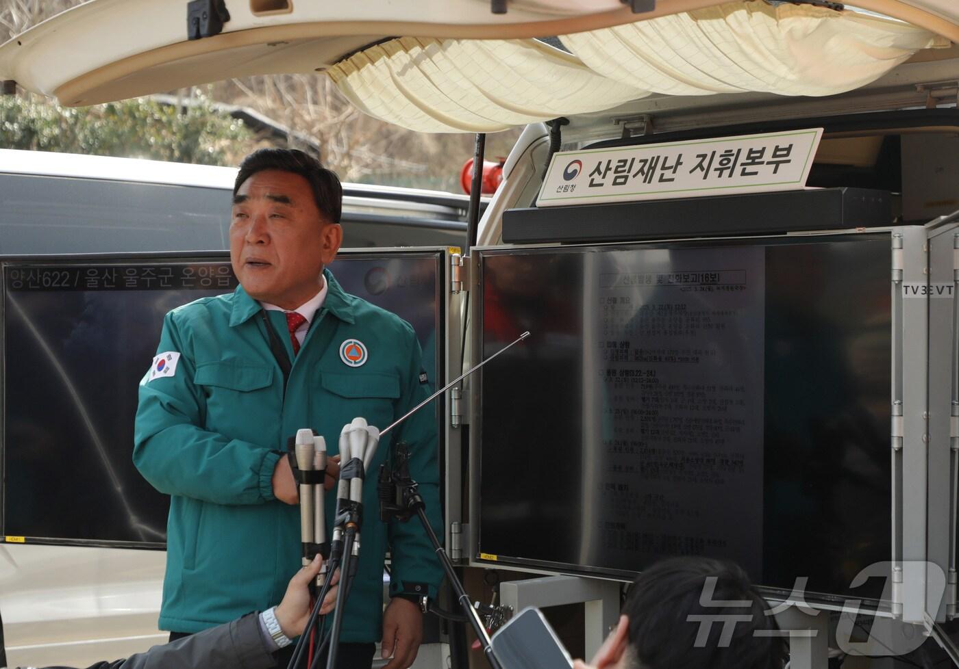 김두겸 울산시장이 24일 울산 울주산불과 관련해 관계부처, 유관기관과 함께 상황브리핑을 한 뒤 현장브리핑을 하고 있다.2025.3.24/뉴스1 ⓒNews1 김지혜기자