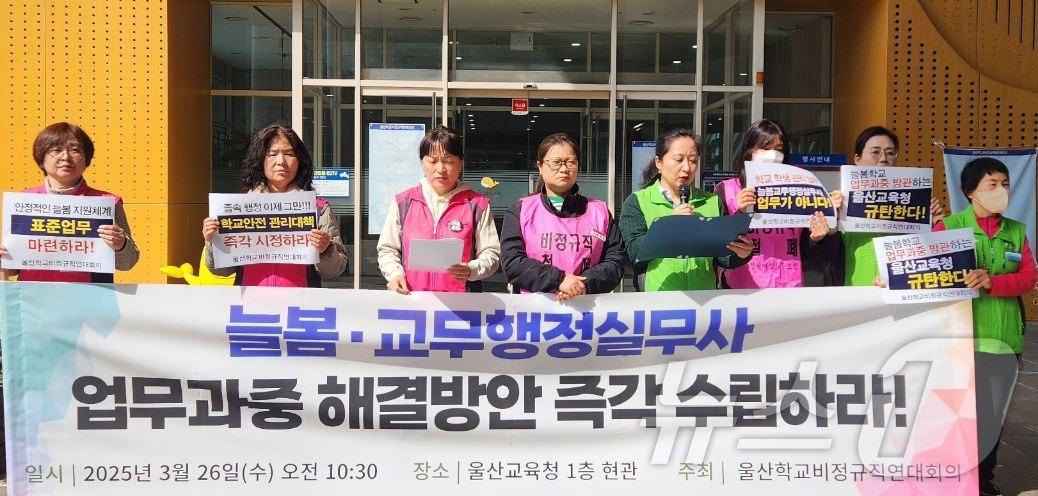 "교사 업무, 늘봄·교무행정실무사에게 전가"울산학교비정규직연대회의 관계자들이 26일 울산교육청 1층 현관 앞에서 기자회견을 하고 있다. (울산학비연대 제공. 재판매 및 DB 금지) /뉴스1관련 키워드늘봄조민주 기자 울산시, 인터넷·스마트폰 과의존 예방 전문인력 모집울주군 가축분뇨 처리시설 존폐 위기…군의회 "대책 마련하라"관련 기사부산교육역사관, '우리 땅 독도' 등 체험 프로그램 운영부산교육청, 초3 전체에 연 50만원 '방과후 이용권' 쏜다[오늘의 주요일정] 부산·경남(15일, 목)"학교 가는 것 기다려져" 군위 '거점학교 정책' 성과[오늘의 주요일정] 부산·경남(13일, 화)