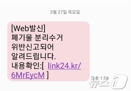 31일 울산 중구에 따르면 최근 일부 주민에게 ‘폐기물 분리수거 위반 신고돼 알려드립니다’라는 문구와 함께 악성 앱 설치 인터넷 주소(URL)가 담긴 문자가 발송된 사실이 확인했다.(울산 중구 제공. 재판매 및 DB 금지)/뉴스1관련 키워드울산중구스미싱김세은 기자 尹 '체포 방해' 등 징역 5년 선고에 울산시민 반응 엇갈려울산 중구 '동 지역사회보장협의체' 위원 모집…임기 2년
