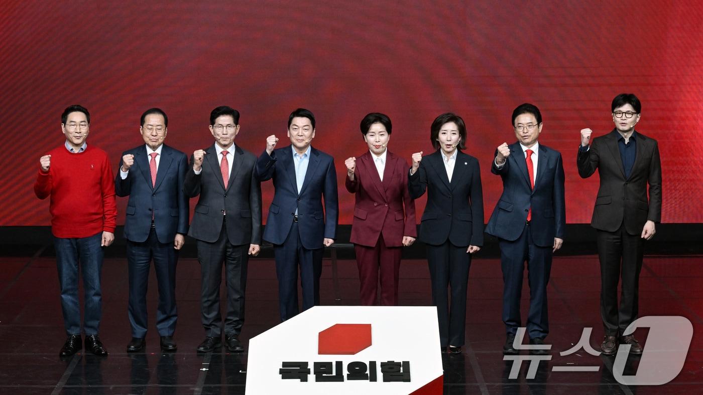 18일 서울 강서구 ASSA 아트홀에서 열린 ‘제21대 대통령 후보자 국민의힘 1차 경선 후보자 비전대회’에서 후보자들이 기념촬영을 하고 있다. 왼쪽부터 유정복, 홍준표, 김문수, 안철수, 양향자, 나경원, 이철우, 한동훈 후보. (공동취재) 2025.4.18/뉴스1 ⓒ News1 이재명 기자