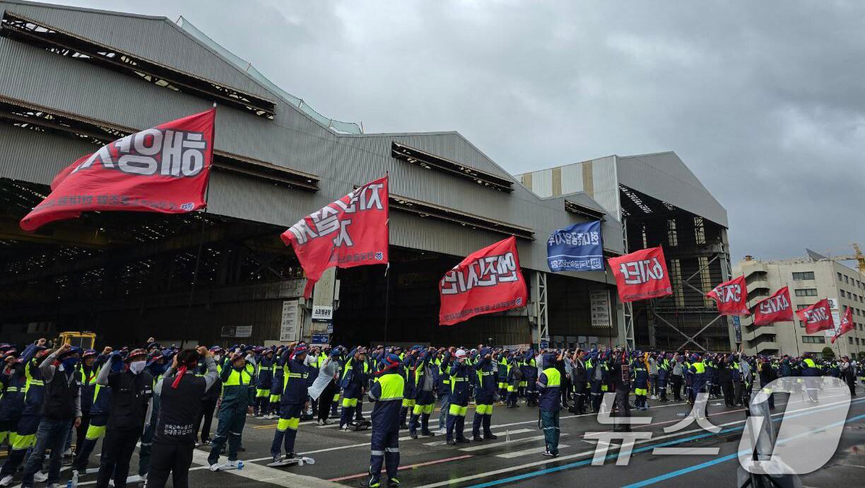 HD현대중공업 노조 조합원들이 28일 울산 조선소 노조 사무실 앞에서 중앙쟁의대책위원회 출범식을 하고 있다. (HD현대중공업 노조 제공) 2024.8.28/뉴스1 ⓒ News1관련 키워드현대중공업 노조민주 기자 울산시, 고액체납자 91명 출국금지…"조세정의 실현"울산시 AI수도추진본부장에 과기부 김형수 부이사관 임용관련 기사인도 'LNG 추진 컨선' 첫 수주…제2 중국? K-조선 영토 확장?K-전력기기 3Q 성적표도 '방긋'…증설하고 사업 확장 '분주'김종훈 울산 동구청장 '시장 출마설'에 유력주자들 '도전장'HD현대미포 노사, 올해 단체교섭 조인…"지속 가능 성장" 다짐송언석 "與 반기업 악법에 경제 죽어가…방송장악 중단해야"