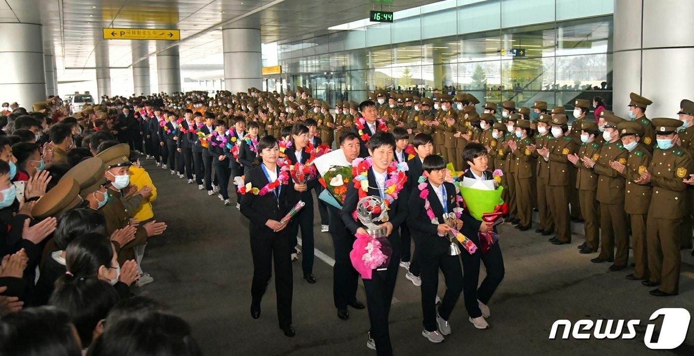 (평양 노동신문=뉴스1) =2024년 아시아축구연맹(AFC) 20살 미만 여자 아시안컵 대회에서 우승을 차지한 여자 축구선수들이 귀국했다. 이들을 환영하는 북한 주민들이 모두 마스크를 착용하고 있다. [국내에서만 사용가능. 재배포 금지. DB 금지. For Use Only in the Republic of Korea. Redistribution Prohibited] rodongphoto@news1.kr