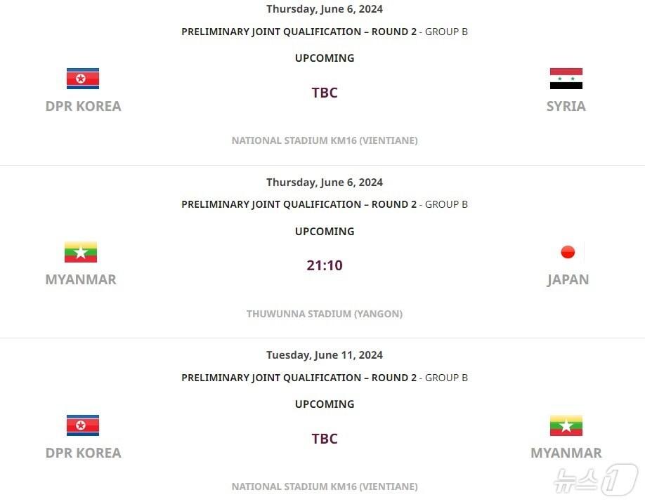 AFC, 6월6일 시리아전·6월11일 미얀마전 라오스서 개최 안내 북한 국제 스포츠대회 복귀 이후에도 홈경기 개최 반복 무산북한이 시리아와 미얀마와의 2026년 북중미 월드컵 아시아 2차 예선 홈 경기를 평양 김일성경기장이 아닌 라오스에서 가질 예정이다. (출처=아시아축구연맹(AFC)) 2024.5.21./뉴스1관련 키워드북한월드컵예선경기시리아미얀마라오스이창규 기자 비운의 케네디家…35살 케네디 외손녀, 희귀병에 요절(종합)브라질 리우데자네이루 새해 행사 250만명 운집…"세계 최대 기네스 기록"관련 기사여자축구, 내년 아시안컵서 호주·이란·필리핀과 A조 편성세대교체 속 들어 올린 우승컵…여자축구 미래가 더 기대된다'동아시안컵 우승'이 가져다준 자신감…여자축구, 中-日과 어깨 나란히긴장감 떨어지는 동아시안컵? 홍명보호 동기부여는 충분하다K리그1 안양 리영직, K리그2 부산 임민혁 맞임대