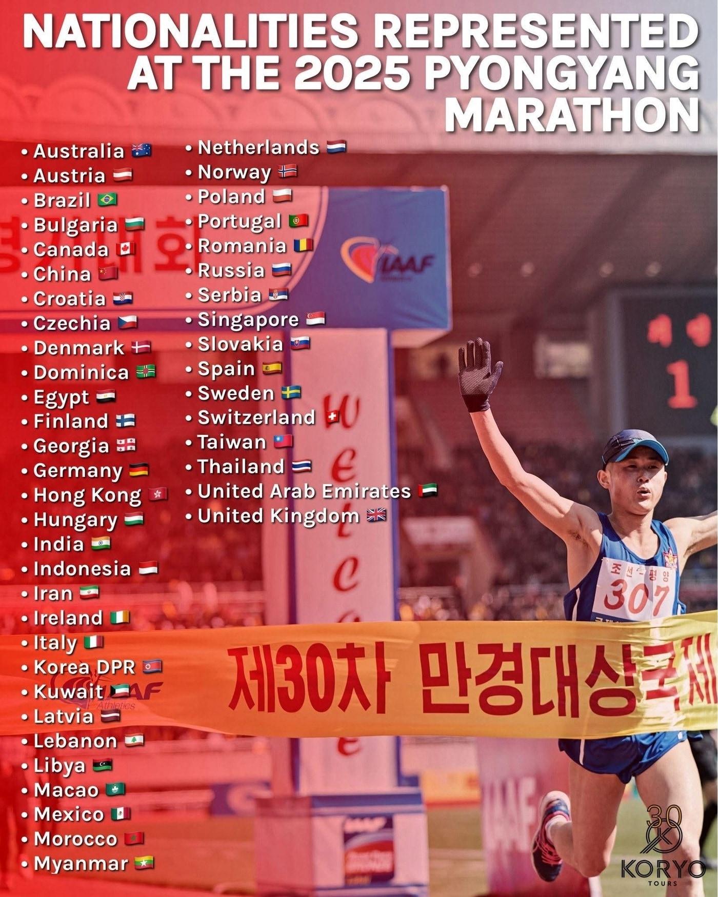 나선 관광 중단 속 대회 정상 개최 주목 제31회 평양 국제마라톤 참가자들 국적(고려투어스 SNS 캡처)관련 키워드북한평양 마라톤양은하 기자 "美보다 日지도자 좋다" 韓 호감도, 다카이치·시진핑·트럼프 순프랑스 재무 "美, 그린란드 강제 병합하면 EU와 무역관계 훼손"관련 기사자가용 소유의 제도화가 미칠 파장[정창현의 북한읽기]평양-상하이 정기편 띄웠지만…"실제 운항은 4번뿐"북한, 3주 만에 중단한 나선관광 재개 예정…"곧 공식 발표""구글·애플 앱 사용주의"…'평양마라톤' 가이드라인 더 꼼꼼해졌다北, 내년 4월 5일에 평양마라톤대회 개최…"5시간 만에 표 매진"