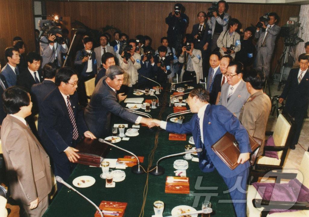 1989년 북측 통일각서 남북회담 중 11분 가량 정전 발생1990년대 '고난의 행군'으로 대표되는 경제난 조짐 노출돼1989년 10월 12일 판문점 우리측 지역 평화의 집에서 열린 고위급회담 3차 예비회담.(통일부 제공) 관련 키워드북한남북회담 사료통일부양은하 기자 인권단체 "이란 시위 사망 최소 2571명"…트럼프 "도움 곧 간다""사망자 남편을 수사하라니"…ICE 총격사건 수사검사 6명 줄사직관련 기사1992년 이산가족 상봉 불발…1년 뒤 북송된 '비전향 장기수' 리인모'핵보유국' 주장하는 北, 과거엔 "한반도에 핵도, 살상 무기도 안 돼" 주장30여년 전 北, "특수관계, 모호해" 지적…"나라와 나라 사이 아냐"'남북기본합의서' 어떻게 채택됐나…30여년 만에 공개된 사료집'남북 갈라서자'며 DMZ에 방벽 세운 北…35년 전엔 180도 달랐다