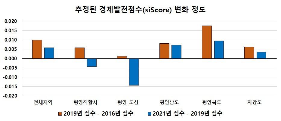 통일부, KAIST '위성자료 활용 북한경제 변화 분석' 용역결과 공개"대북제재 기간 경제발전 정체…코로나 기간엔 역성장"통일부가 공개한 한국과학기술원(KAIST)의 '위성자료를 활용한 북한 경제 변화 분석' 연구용역 결과에 나타난 경제발전점수(siScore) 변화 정도.(통일부 제공)관련 키워드북한위성사진통일부구교운 기자 겨울철 난방에 눈 뻑뻑하다면…"안구건조증 이렇게 막으세요"정은경 "탈모·비만 건보 적용 검토…재정 영향 따져 결정"(종합)관련 기사[단독] 北 신의주에 치솟은 검은 연기…'당 위원회 건물'에 큰불美, '대북 드라이브' 자주파에 '경고'?…한미, 아직 대북 조율 덜 됐다李정부, 남북군사회담 첫 제안…"군사분계선 기준선 논의하자"(종합)北, 금강산 내 남측 시설 대부분 철거…'전면 재개발' 가속화통일부 "'헌법존중 TF 지침' 받아…기조실서 운영 방안 검토"