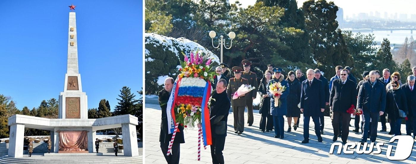 (평양 노동신문=뉴스1) = 북한 노동당 기관지 노동신문은 지난 2월 23일 러시아 기념일인 '조국수호자의 날'을 맞아 러시아 대사관 성원들이 해방탑과 소련군열사묘에 화환을 진정했다고 24일 보도했다. [국내에서만 사용가능. 재배포 금지. DB 금지. For Use Only in the Republic of Korea. Redistribution Prohibited] rodongphoto@news1.kr