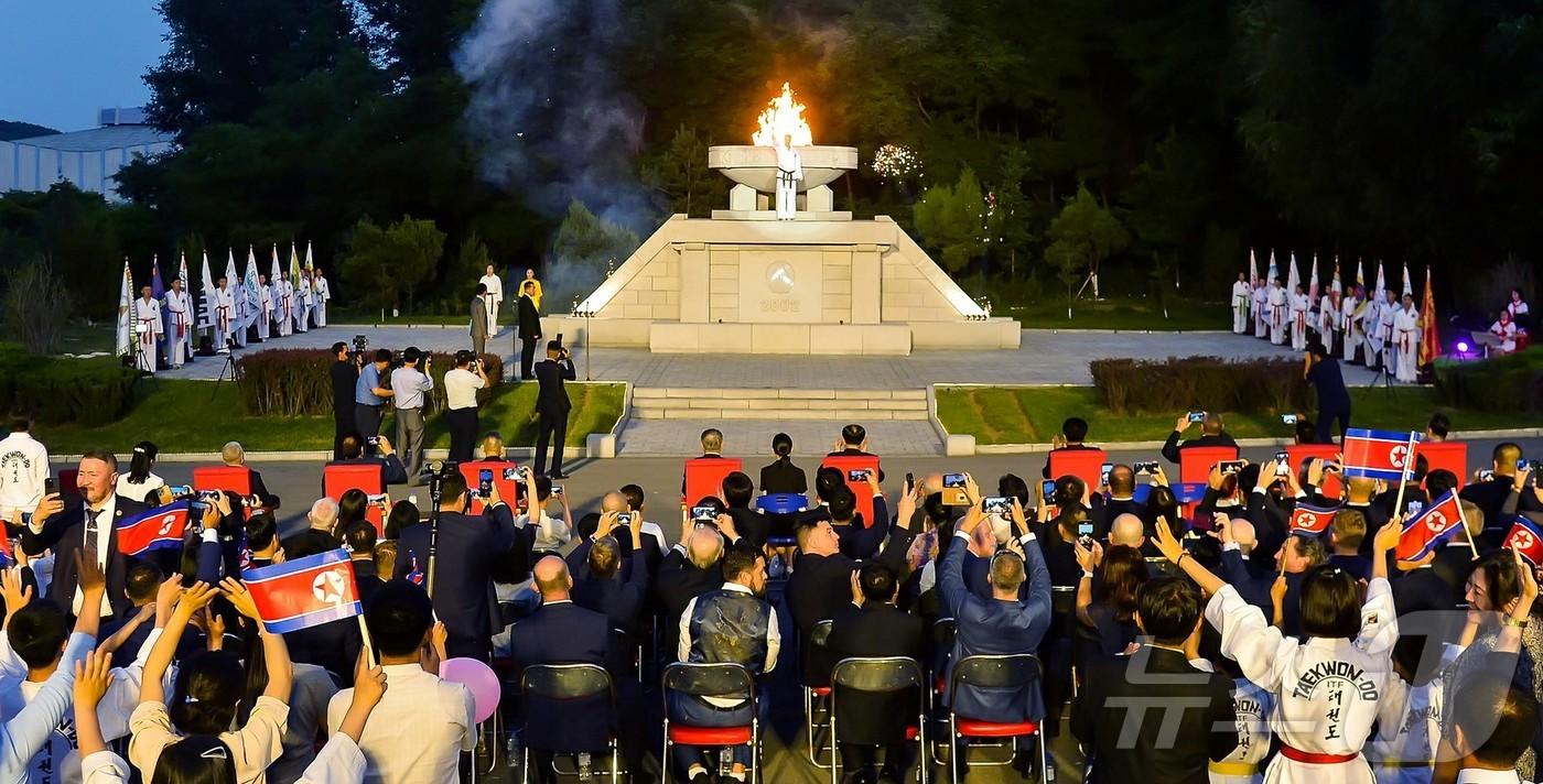 (평양 노동신문=뉴스1) = 북한 노동당 기관지 노동신문은 18일 "제9차 국제무도경기대회 봉화채화 의식이 지난 17일 평양에서 진행됐다"면서 "청춘거리 체육촌에 있는 무도봉화대에서 채화된 봉화는 올해 11월 우즈베키스탄의 타슈켄트에서 열리는 제9차 국제무도경기대회 개막식장의 봉화대에 지펴지게 된다"라고 보도했다. [국내에서만 사용가능. 재배포 금지. DB 금지. For Use Only in the Republic of Korea. Redistribution Prohibited] rodongphoto@news1.kr