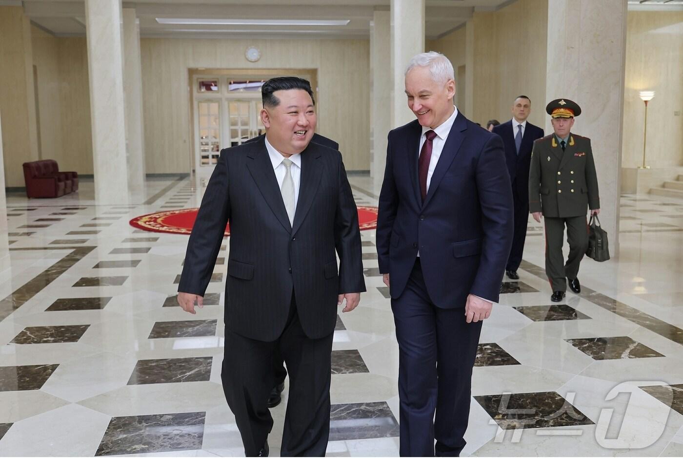 (평양 노동신문=뉴스1) =김정은 북한 노동당 총비서가 방북한 안드레이 벨로우소프 러시아 국방장관을 만나 '우크라이나 사태 발전'에 대해 우려를 표하고 미국의 행동이 "국제사회의 규탄을 받아야 한다"라고 말했다고 당 기관지 노동신문이 30일 보도했다. [국내에서만 사용가능. 재배포 금지. DB 금지. For Use Only in the Republic of Korea. Redistribution Prohibited] rodongphoto@news1.kr