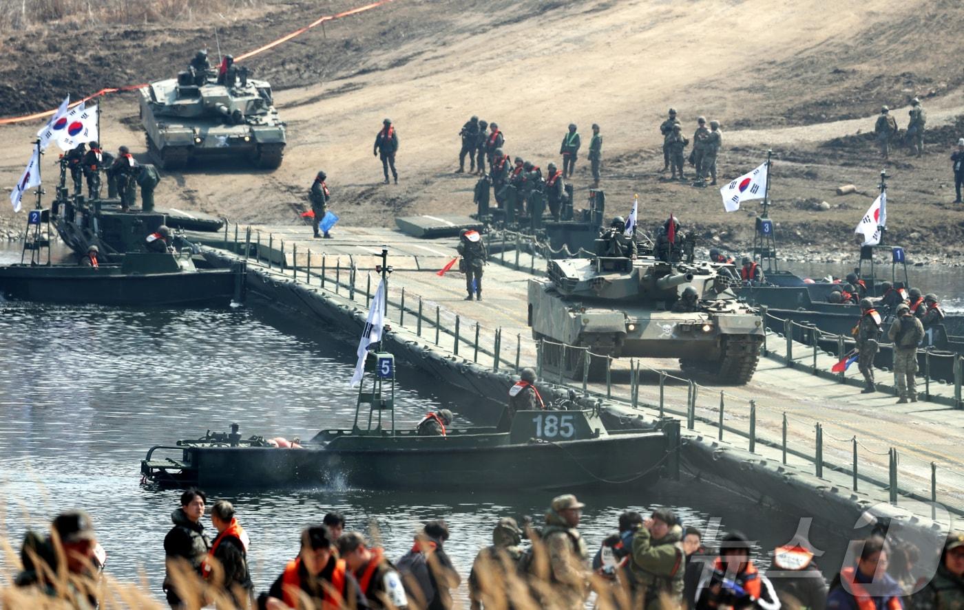 외무성 군축 및 평화연구소 공보문 발표20일 경기 연천군 임진강 일대 석은소 훈련장에서 열린 한미 연합 제병협동 도하훈련에서 K1E1전차가 연합부교를 건너고 있다. 2025.3.20/뉴스1 ⓒ News1 사진공동취재단관련 키워드한미연합훈련외무성공보문북한최소망 기자 김정은, 청년동맹 80주년 행사…"청년은 유일무이한 조선의 힘"(종합)김정은, 청년동맹 80주년 행사 참석…"청년은 유일무이한 조선의 힘"