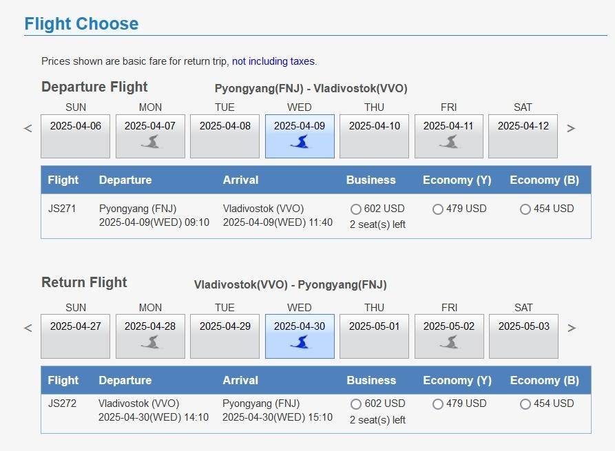 평양국제마라톤대회, 갈마해안지구 개장 등 관광 일정 의식한 듯고려항공 예약 페이지에 '평양~블라디보스토크' 노선이 월, 수, 금 주 3회 가능한것으로 확인된다. (고려항공 홈페이지 갈무리)'플라이트레이더24'에 예정된 평양~블라디보스토크 일정표. (플라이트레이더24 갈무리)관련 키워드북한고려항공북러관계블라디보스토크유민주 기자 9차 당 대회 앞두고 농촌 발전 선전…새해 '체육의 날' 활동 [데일리 북한]새 병원 완공한 北, 의료기술 '현대화'도 선전관련 기사북한도 평양~모스크바 직항선 선전…북러 교류 정점으로유지훈 실장 "차기 정부, '안정적 동맹·주도적 외교' 원칙 견지해야""러, 작년 북한 주민에 비자 발급 1만여 건…상위 10개국에 北 포함"주한 러대사 "韓, 우크라 무기지원 경고 심각하게 받아들여"